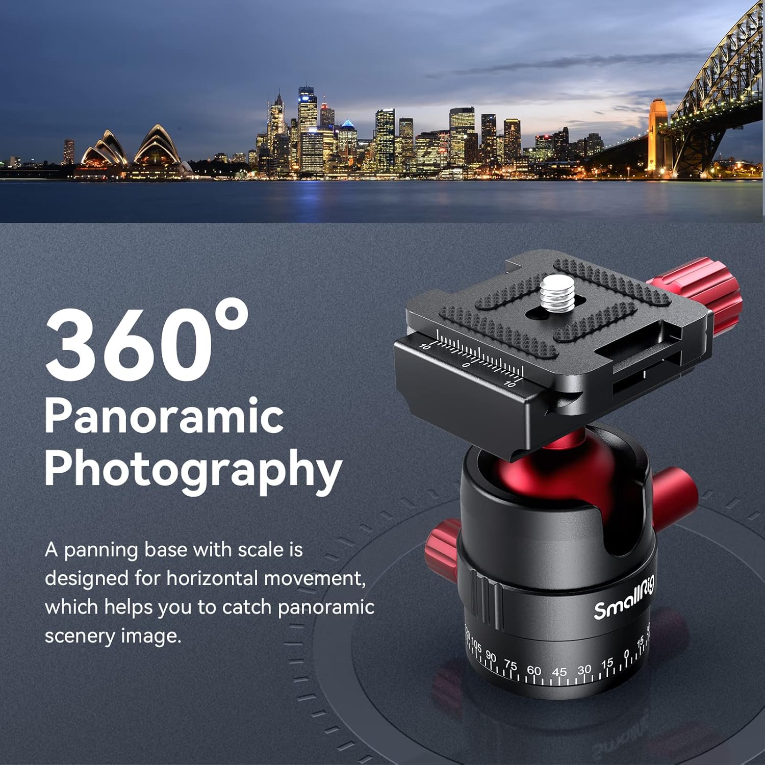 - ăFully Adjustableă- The dual-action ball head has an independent pan lock that enables you to rotate the base 360° for panoramic photography, and a ball lock to position your camera at a variety of angles.