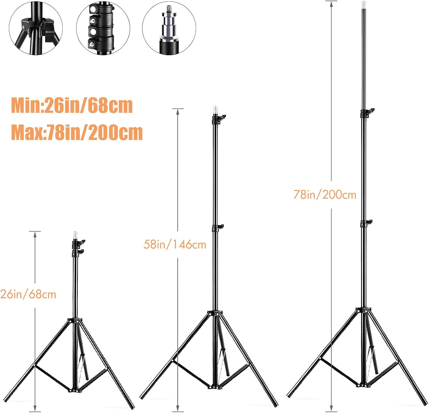 - Adjustable Metal Light Stand: The light stand is made of premium aluminum alloy, and can extend from 68-200cm/26-78in; stable 3-leg design and the solid locking system make it safe and reliable to use.
