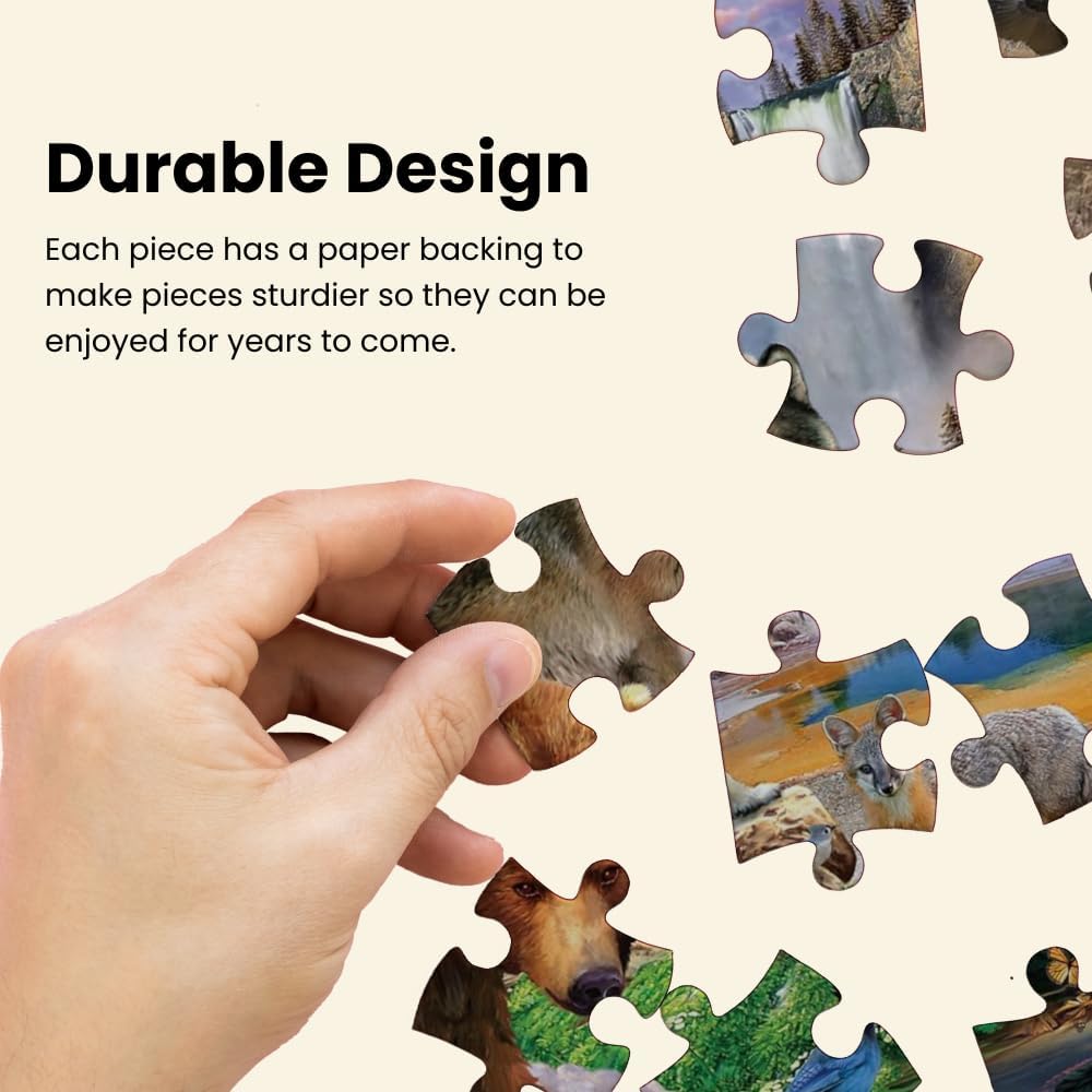 - Durable Design – Our puzzle board is made with 100% thick recycled material and non-toxic, soy-based inks. Each piece has a paper backing to make pieces sturdier so they can be enjoyed for years to come.