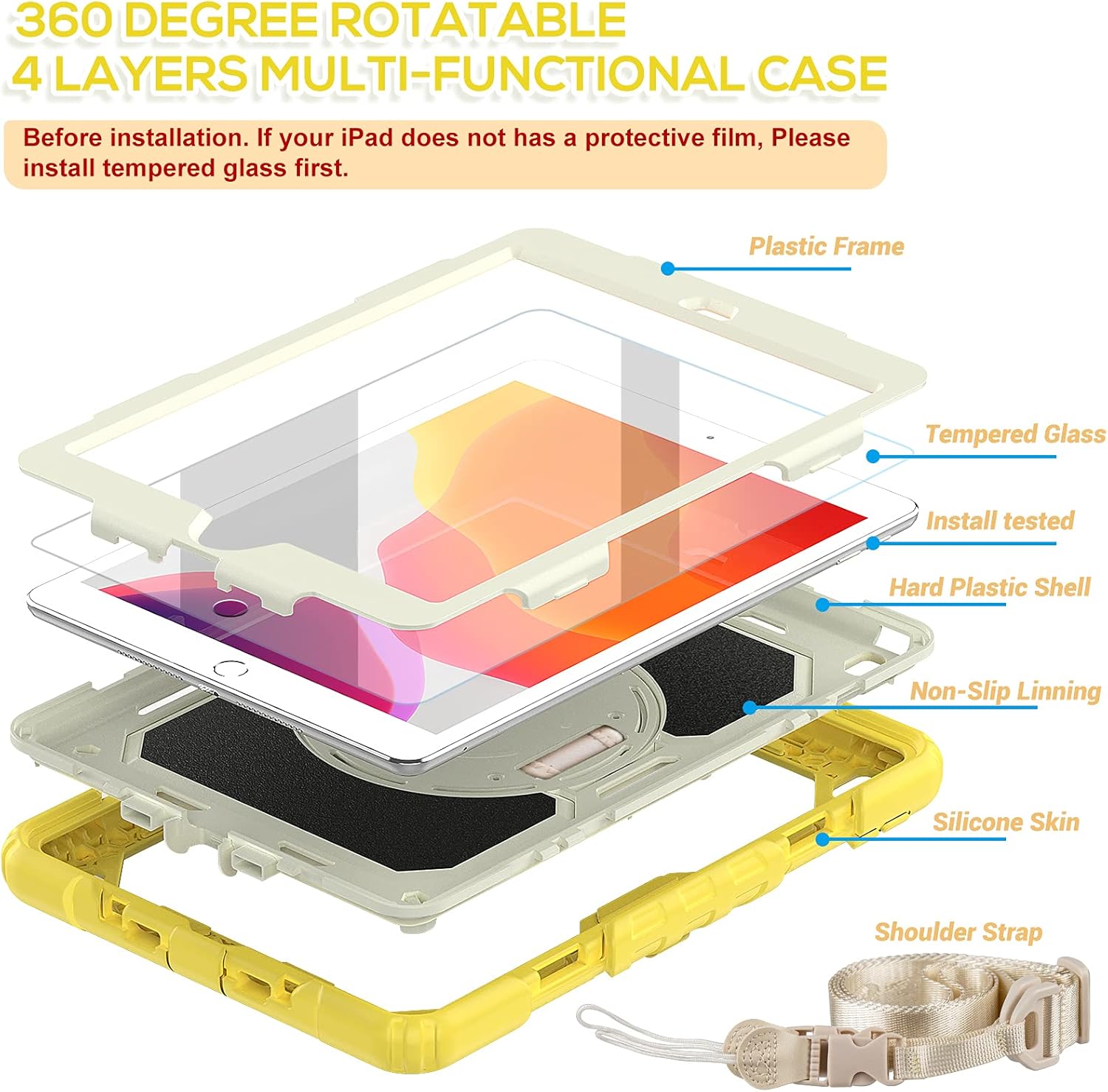 BLOSOMEET Kids Case for iPad 10.2 9th/8th Generation 2021 2020 with Tempered Glass Screen Protector Pen Holder,Cute Girls Boys iPad 7th Gen Cover Rugged w/Stand Hand Shoulder Strap Yellow