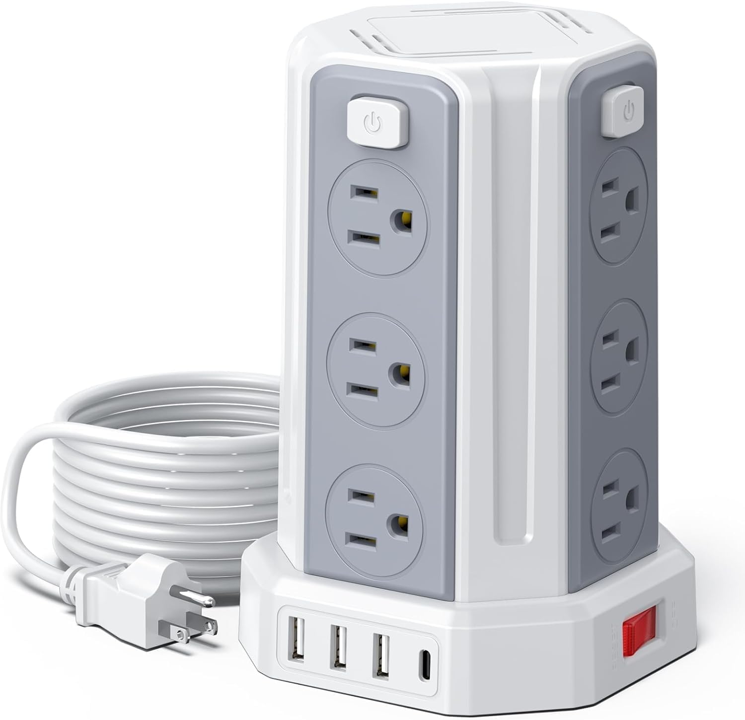 - 【Ultimate Charging Hub: USB Power Strip + 12 AC Outlets】 Power your entire workstation with this USB power strip’s 16-in-1 capacity: 12 widely spaced outlets (4-side tower design) handle large adapters, while 15W USB-C and 12W USB-A ports fast-charge phones, tablets, and gadgets. The surge protector with USB ports outperforms traditional extension cords for tech-heavy setups.