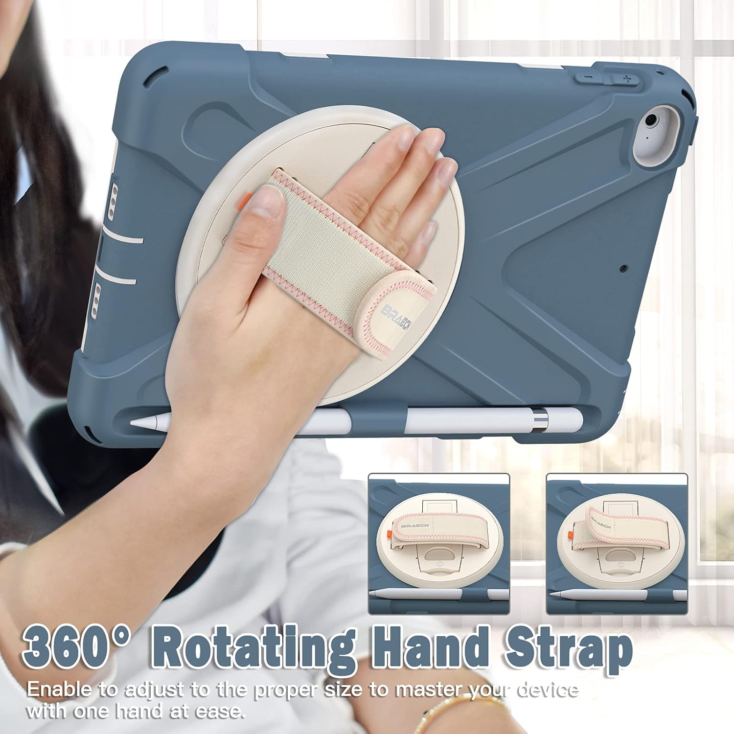 - 360°Rotating Handle/Stand : Located on the back of iPad MINI heavy duty cases, built-in 360 degree rotating kickstand and adjustable handle hand strap provide a more flexible and convenient way to use your tablet during work ,study or journey, ideal for students,teachers,engineers