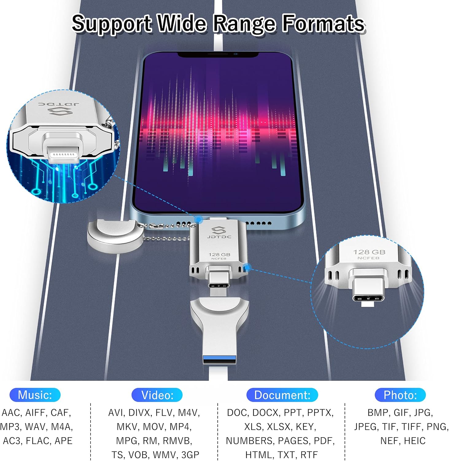 - 3 IN 1 Photo Stick: The Genuine C78 Lightning Connector with Silver Color Supplied by Apple MFi. Ensure photo stick meet Apple's standards for quality, compatibility, and High Transfer Speed. This iPhone memory stick features a 3-in-1 design with Lightning, USB-C, and USB 3.0 connectors. JDTDC iPhone flash drive provides seamless compatibility with iPhones, iPads, Android devices, and PCs, allowing easy data transfer across different platforms.