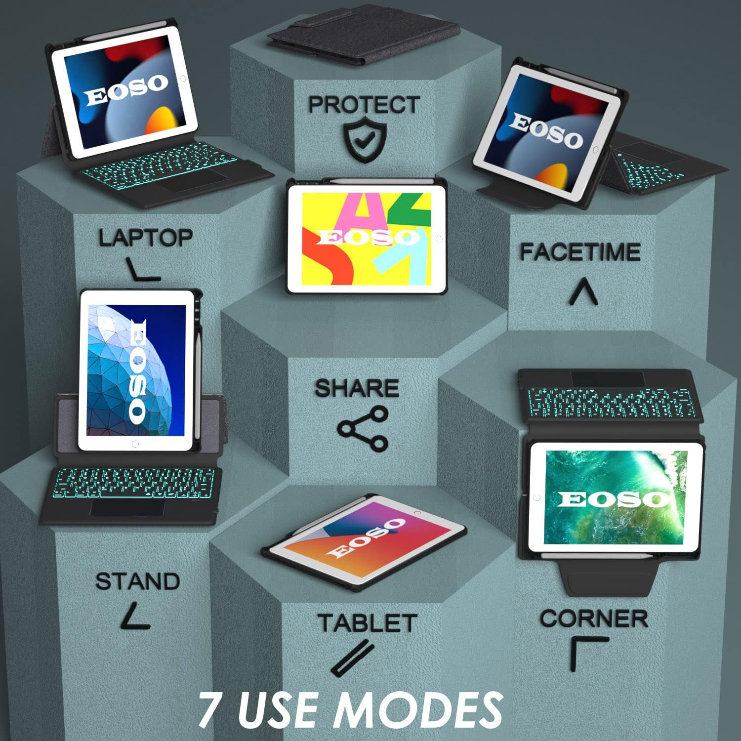 - 7 USE MODES: Unique design of iPad pro 10.2/10.5 keyboard case (20,000 cycle stress tested) allows 270° rotation. You can comfortably use iPad for typing notes, reading, playing games and watching videos. 270° rotation provides multiple viewing angles to meet different visual needs and allows to change your iPad to a small laptop in seconds.