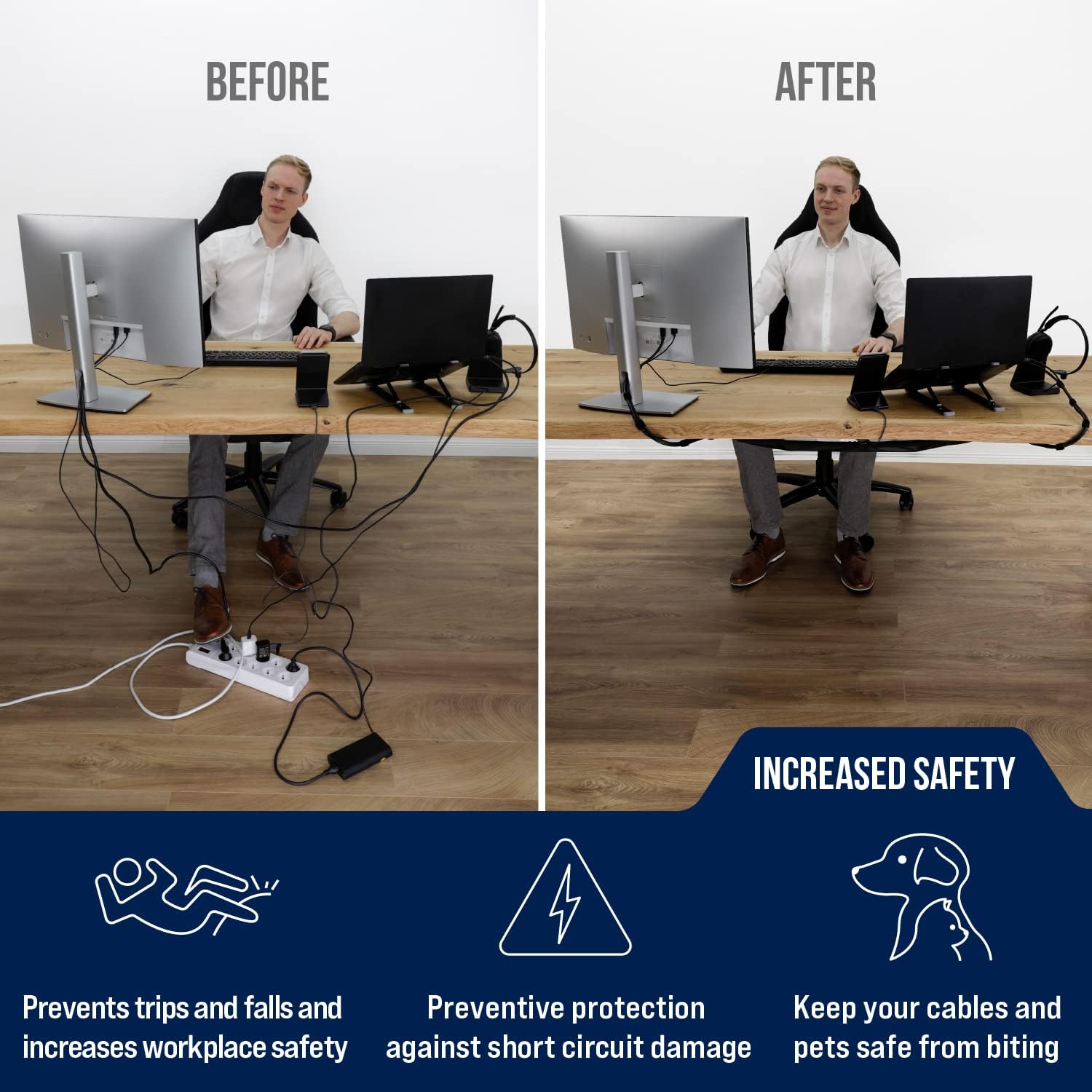 - Hide every cable! A flexible cable net under desk offers enough space to store all power supplies and plugs. Position the under desk cable management tray to sort all cables clips included and keep your cable tidy desk neat.