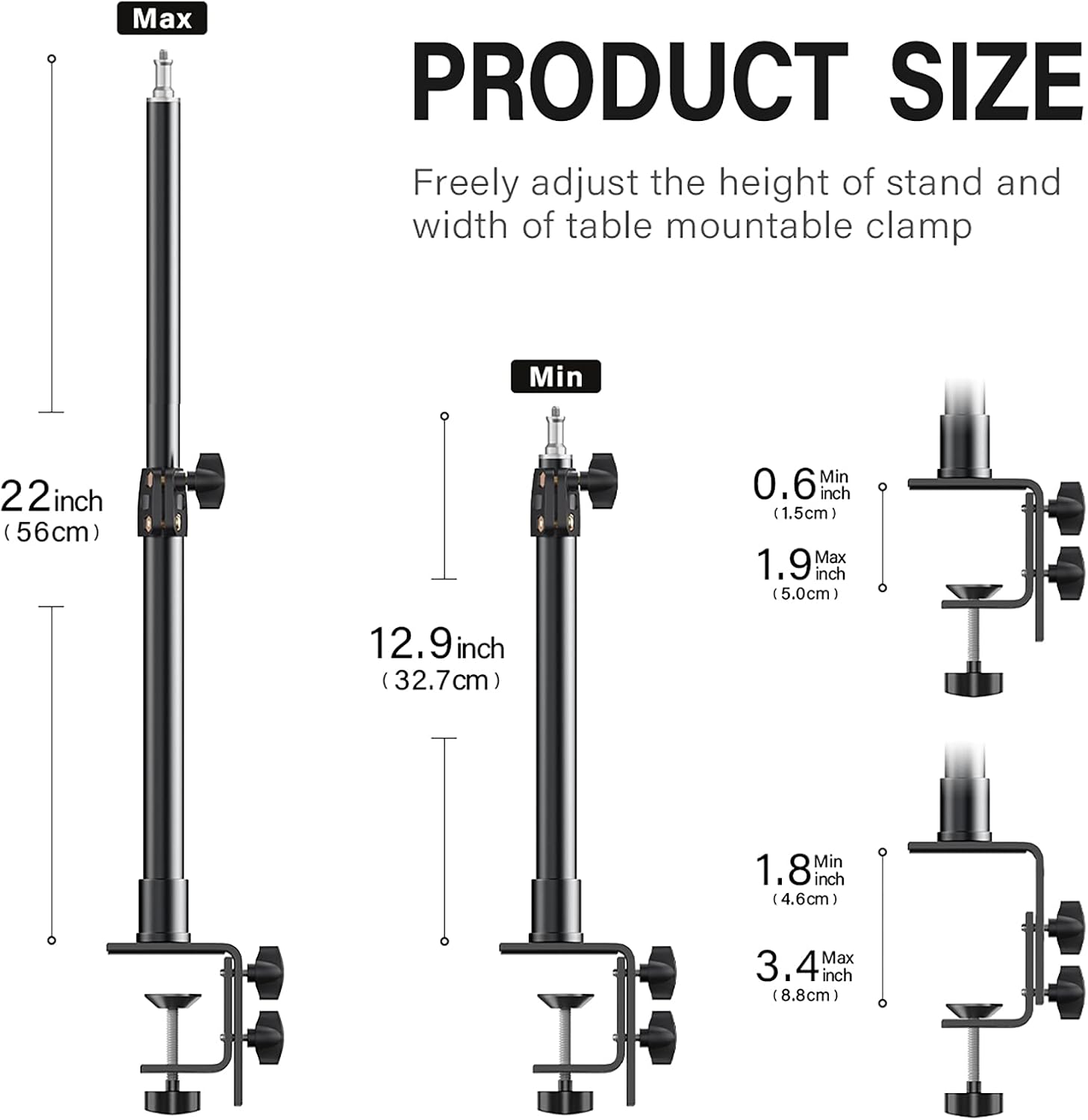 - [Adjustable Tabletop Stand]: Height of stand can be expanded from 12.9 inches to 22 inches; the ball head is 360-degree rotation with the locking knob allows you to adjust at any angle.