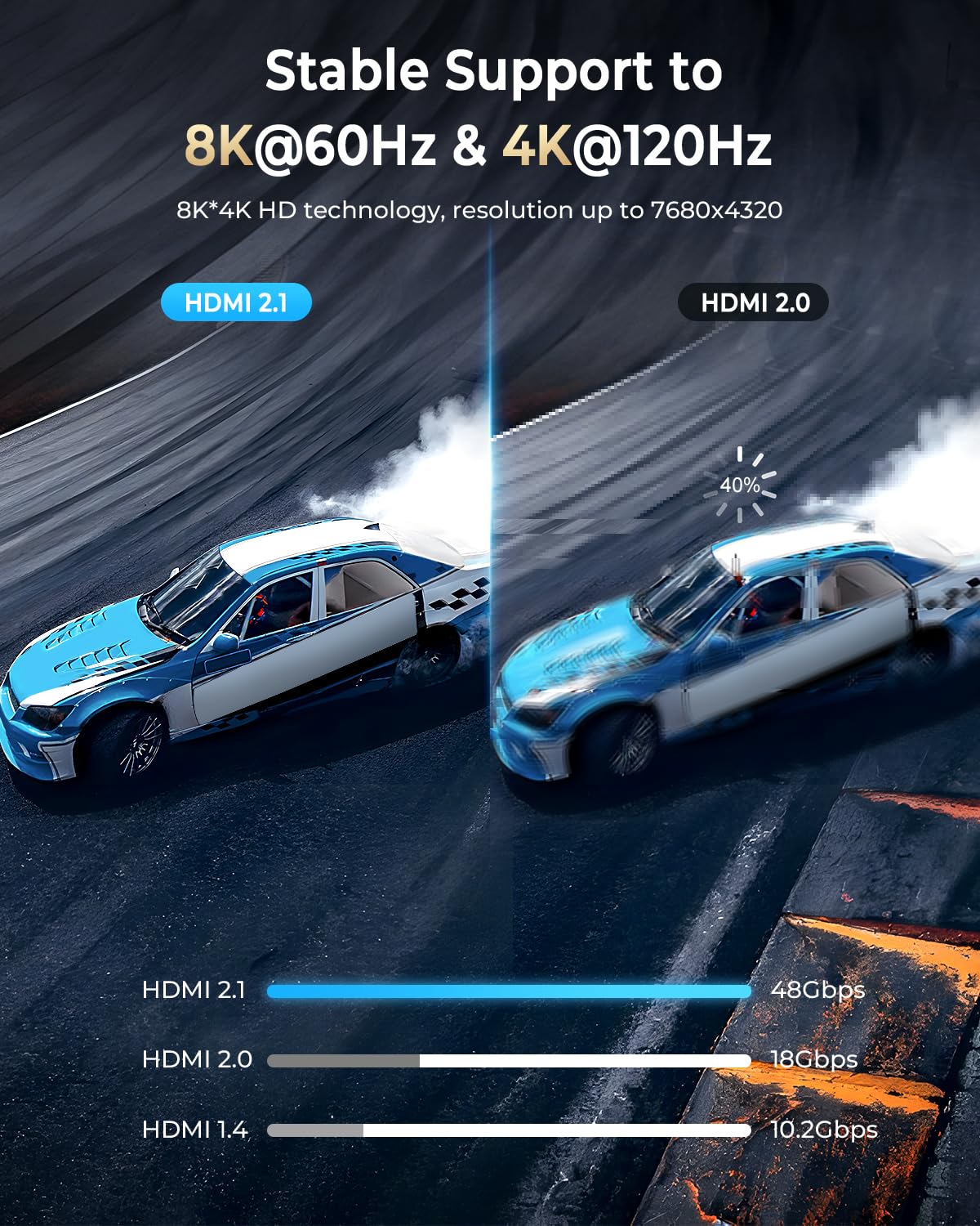 - Upgraded 8K Hdmi Cable: 8K HDMI high-speed transmission bandwidth is up to 48Gbps, which is 2.67 times higher than HDMI 2.0 cables(18Gbps). HDMI 2.1 cable supports 8K 60Hz, 4K 120Hz, high refresh rate and resolution 7680 x 4320, which not only supports for Dynamic HDR and 12-bit color processing technology to restore the most realistic and vivid images. It also supports for eARC, VRR, QFT, ALLM, QMS, DTS:X, 3D video Display and more