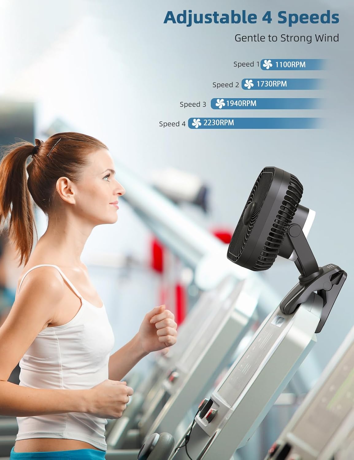 - ăHook DesignăThis camping fan has a built-in hook, you can hang it on the tents, branches or inside a car. You also can simply placed it on desk at home or in office. It also has a sturdy clip with which you can attach the fan to treadmills, toddlerâs car, outdoor camping umbrella, or even golf cart.