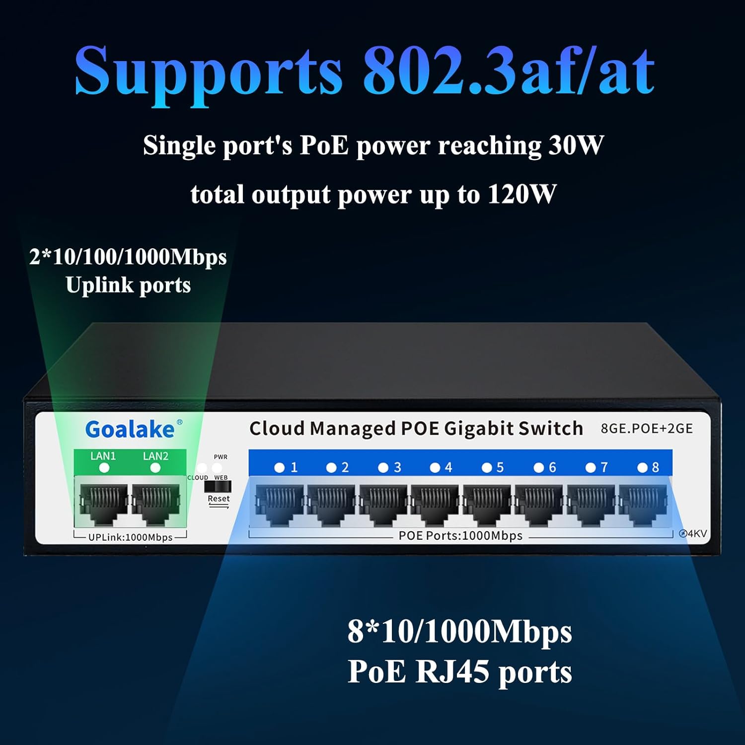 - Gigabit PoE Switch: Goalake gigabit poe switch includes 8 Port POE switch Gigabit and 2 Gigabit Uplink. Compliant with IEEE802.3af/at standard, it can deliver up to 30W for each PoE port. Data, and power can be transferred on one single cable. It supports PoE power up to 120W for all PoE ports.