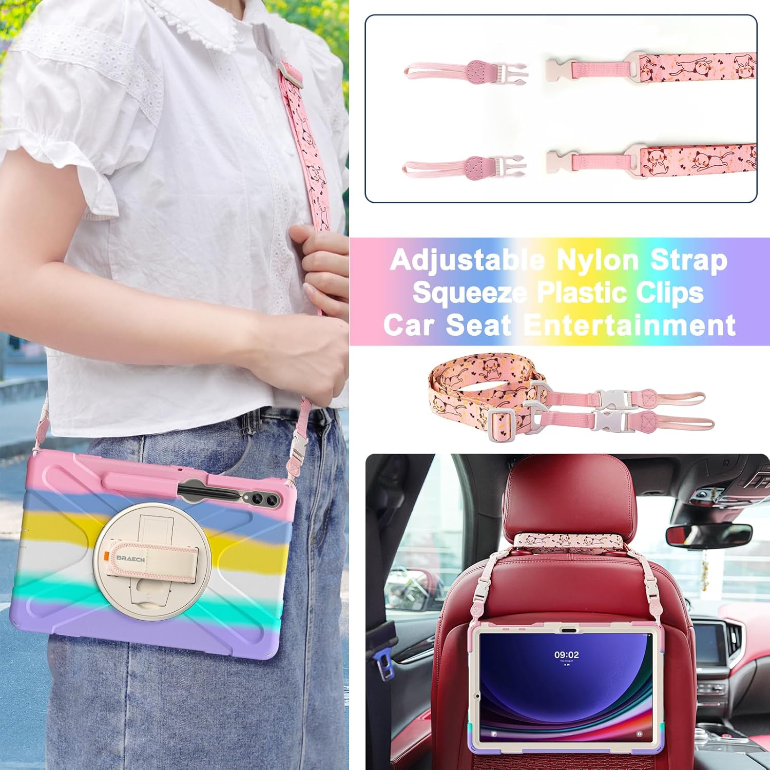 BRAECN for Galaxy Tab S10 Plus Case 2024&S9 FE Plus/S8 Plus/S7 Plus /S7 FE 12.4 Inch,Heavy Duty Shockproof Case with S Pen Holder&360 Rotating Hand Strap/Kickstand/Shoulder Strap for Tab S10+,Rainbow