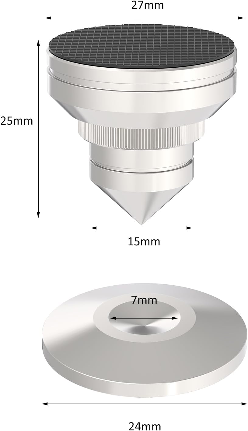 - ❖High Hardness and Density--- the 304 stainless steel audio spikes base pads are with high hardness and density, have low harmonic vibration point and high damping, manage the energy of the speaker to reduce vibrations resonating, eliminate dissonant sound, will never wear out due to vibration like other copper brass isolation feet.
