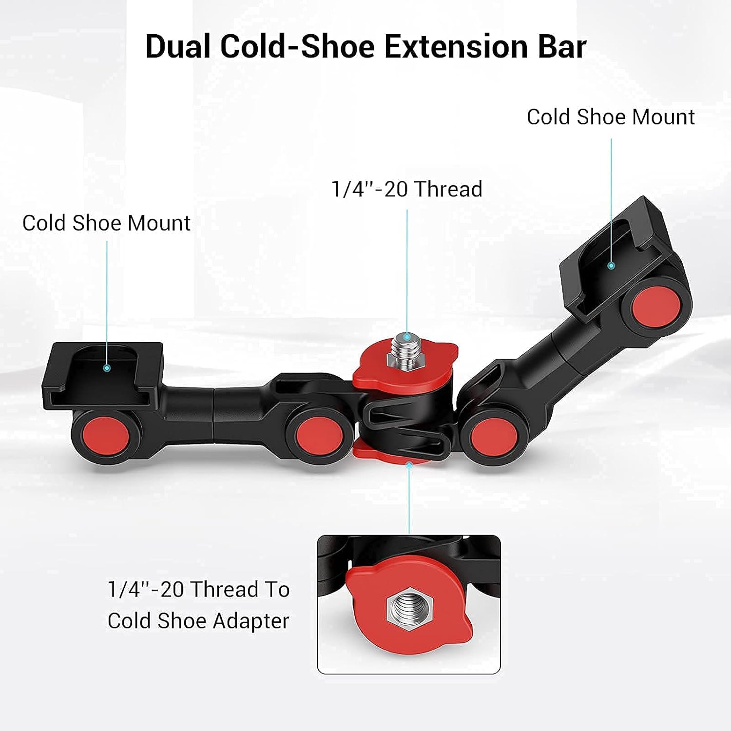 - 【Multi-functional cold shoe mount】dual cold shoe bracket can be used as an extension bar, dual head can be connected to two devices at the same time. Such as monitors, LED lights, microphones and other cold shoe accessories.