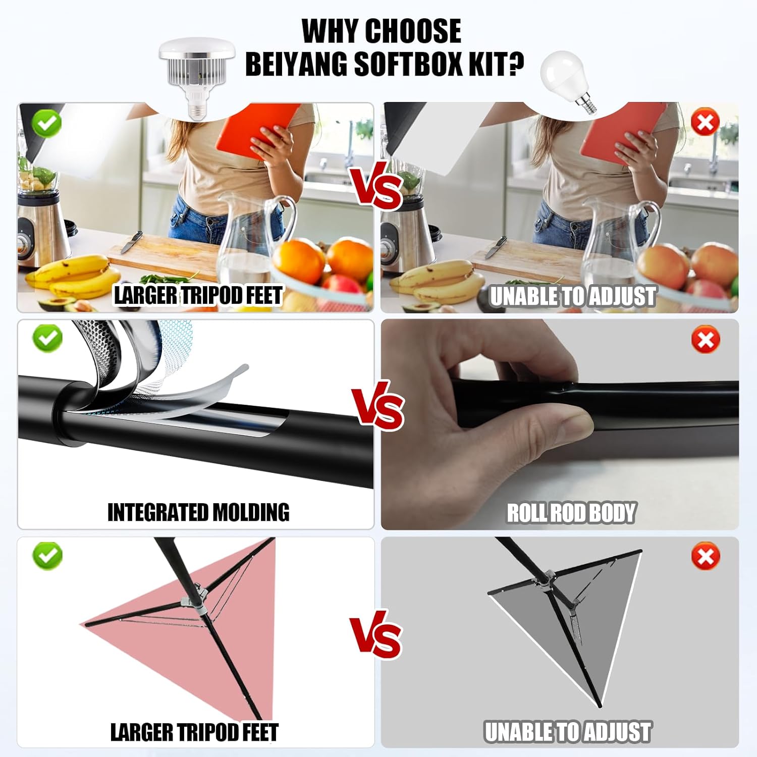 - 【2 softbox lighting kit】 This BEIYANG softbox comes with a 210° rotatable head that can adjust the angle according to your needs. It is suitable for photography art, meeting different needs such as photography lighting, live broadcast, video fill light, etc. It can easily create perfect lighting effects for indoor shooting and make photos more attractive.