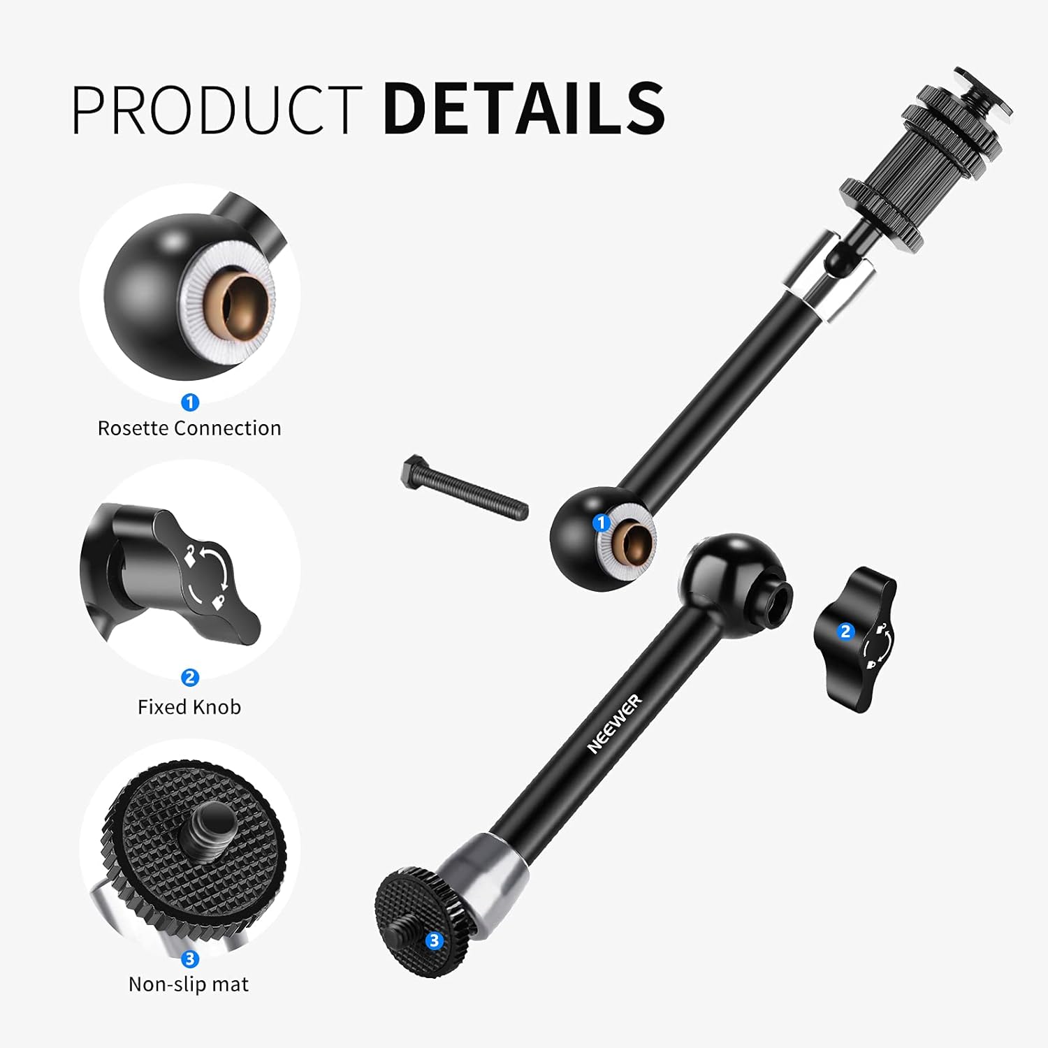 - 【Wide-Angle Shooting】 The magic arm has two 360-degree ball heads and allows you to adjust to any angle, providing a wide range of shooting angles. It’s easy to use with one knob to lock the arm in all positions