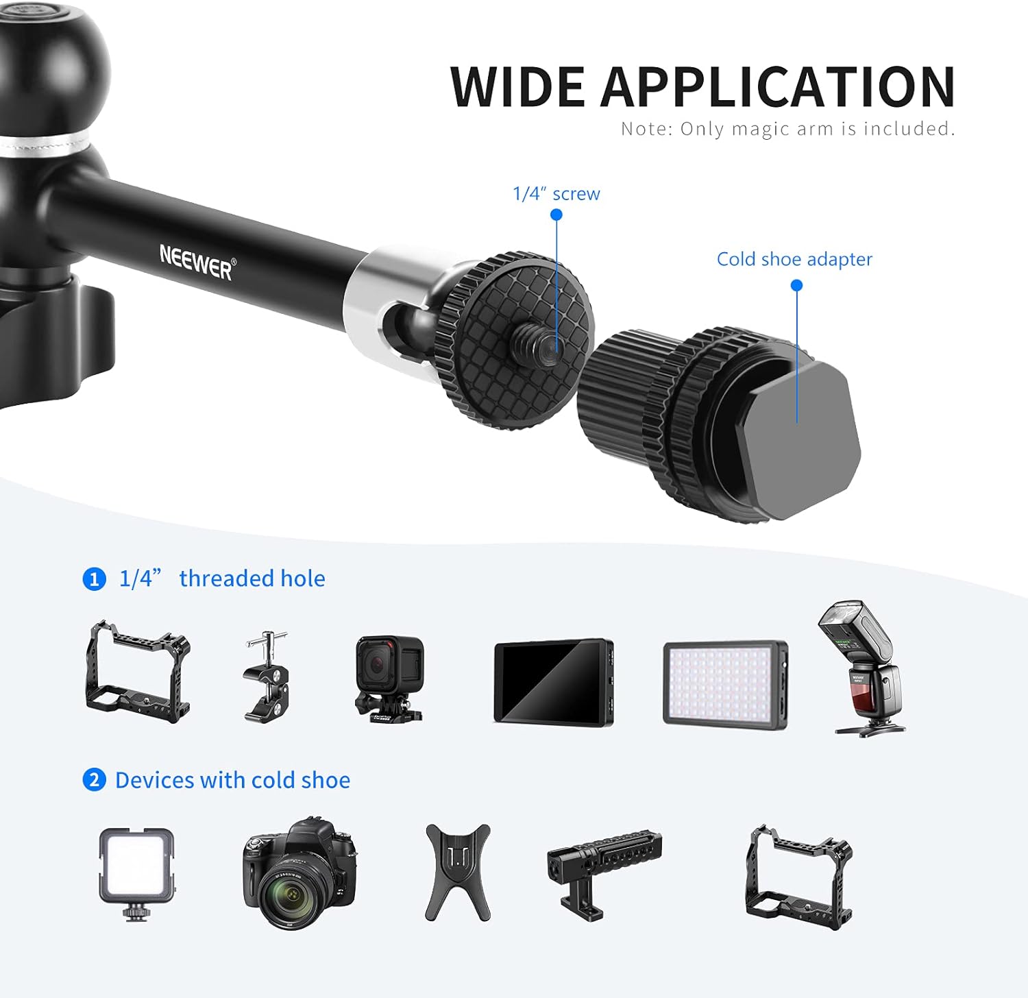 - 【Wide Compatibility】 Equipped with a 1/4” screw and a cold shoe adapter, the 11” magic arm is compatible with devices with 1/4” threaded hole (like flash, LED video light, microphone, field monitor, and super clamp) and devices with cold shoe (like cold shoe holder, phone holder, and camera cage). The super clamp has 1/4” and 3/8” holes and it can be mounted almost anywhere, such as camera, light, umbrella, hook, crossbar, and even other super clamps. Adjust the width from 15mm to 52mm