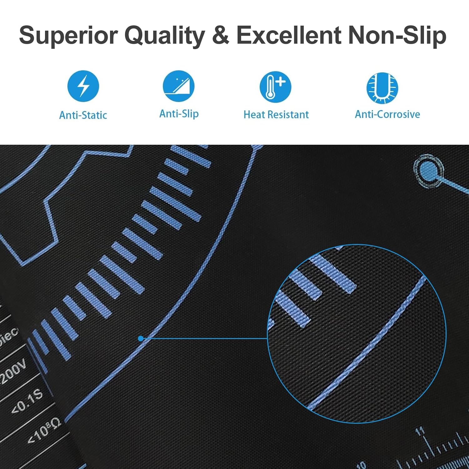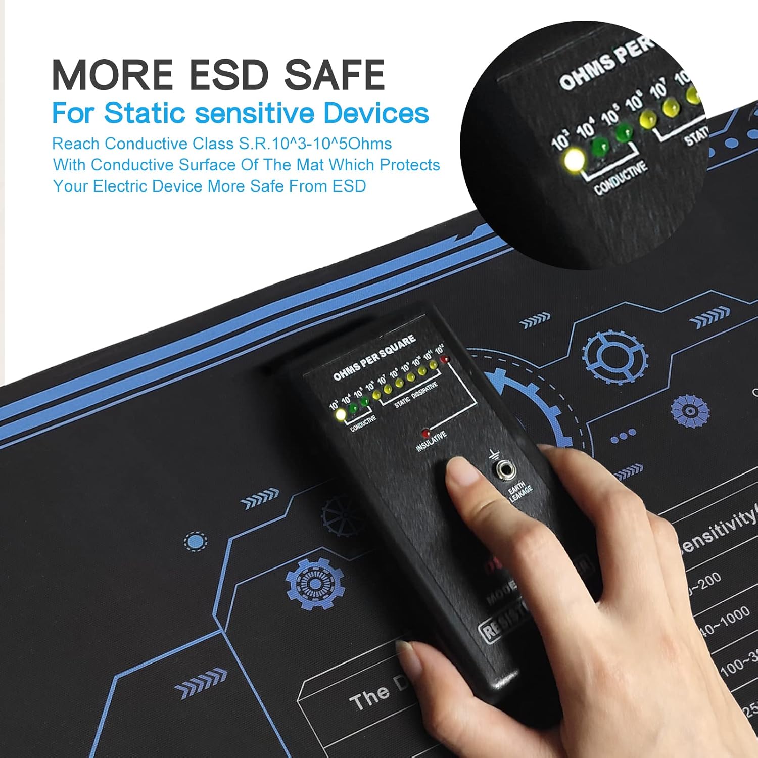 - 【Conductive and Large】Our ESD Bench Mat Size is Large 48 x 24 Inch, Which keeps your bench more tidy and help you working more efficient. Both side are conductive with Surface Resistance of 10^3 - 10^5 ohms. The front side is with anti-slip dotted texture.