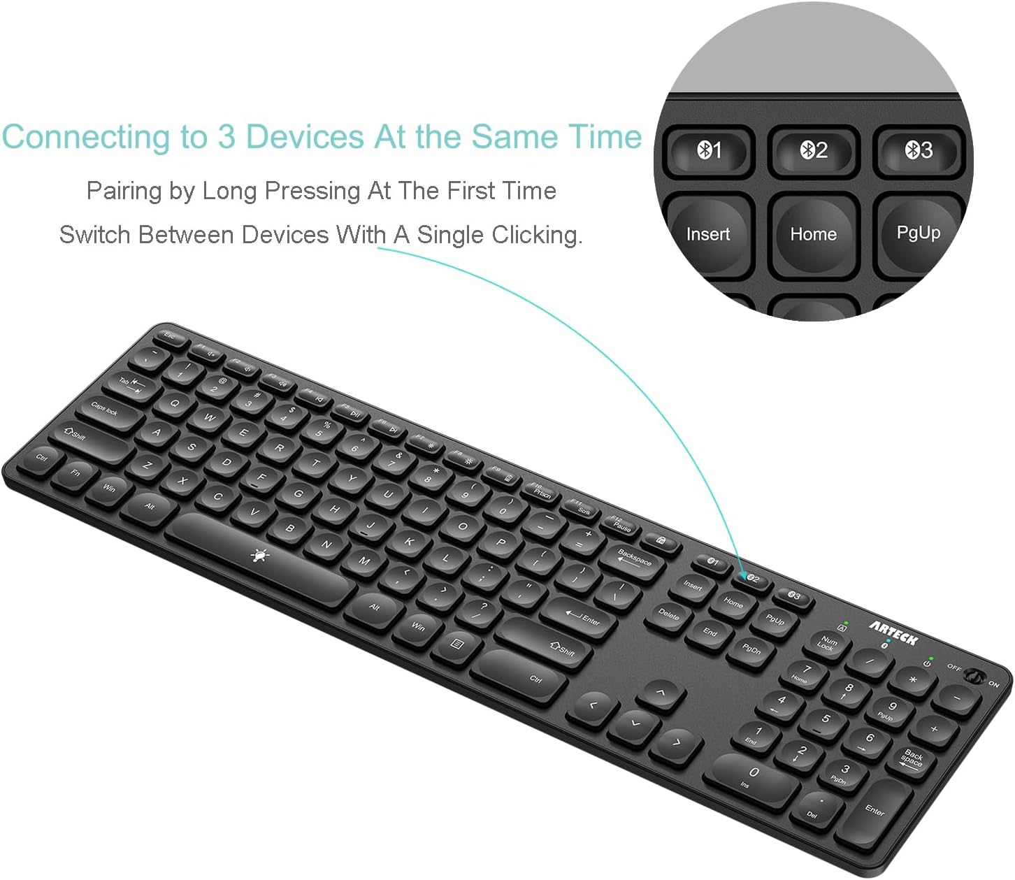 - 3 Devices Switch with A Single Clicking: This keyboard is able to connect to 3 devices at the same time. You can switch between 3 devices with a single key clicking.