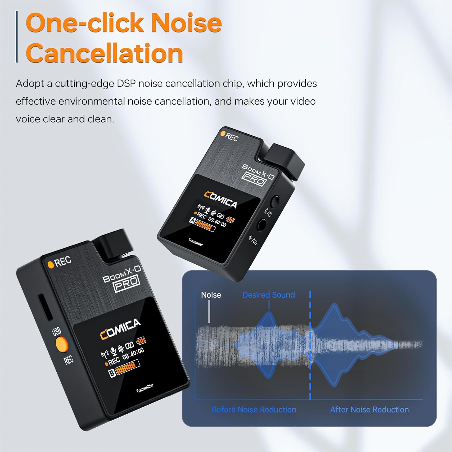 - One-click Noise Cancellation: comica BoomX-D PRO lapel mic adopts a DSP denoise chip, which can effectively cancel out environmental noise, ensuring clear and clean audio for your videos. Additionally, the transmitter's power button can quickly mute the microphone.