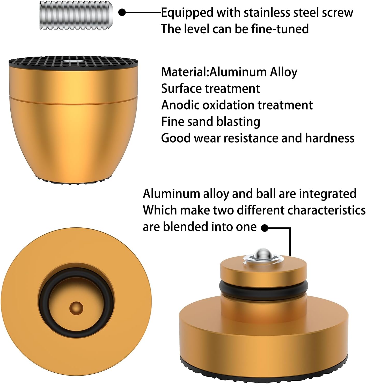 - High-Quality Materials: Crafted from solid all aluminum and CNC machined, these speaker isolation feet feature a surface treatment of anodic oxidation and fine sandblasting, which enhances wear resistance and hardness.