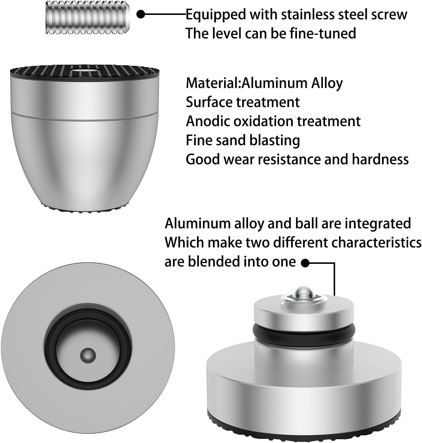 - High-Quality Materials: Crafted from solid all aluminum and CNC machined, these speaker isolation feet feature a surface treatment of anodic oxidation and fine sandblasting, which enhances wear resistance and hardness.