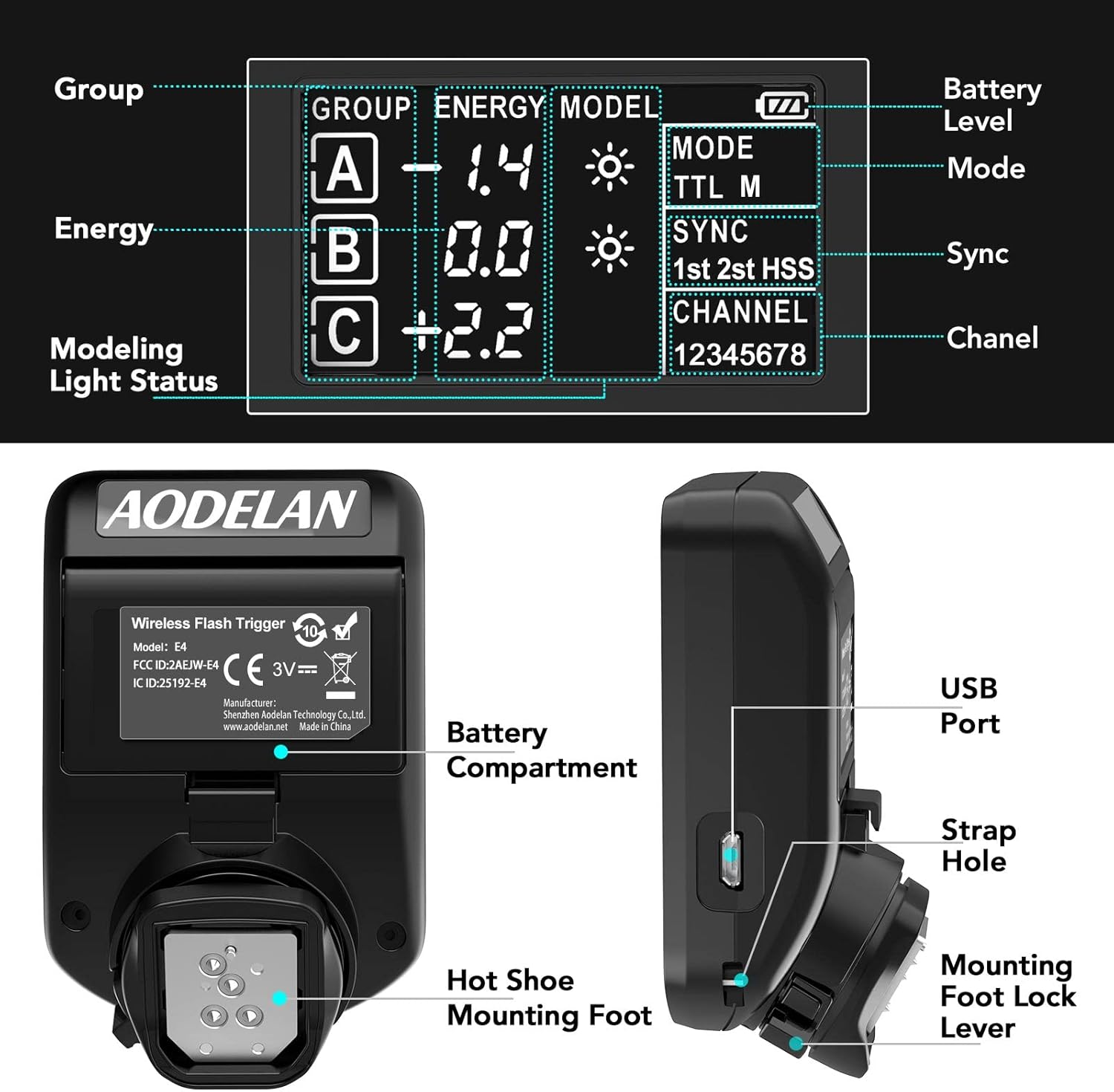 - 8 Digital Channels and 3 Groups - AODELAN E4 flash trigger is a transmitter, also a really a controller. Each channel can control up to 3 groups of flashes. Using 2.4 GHz Frequency, working communication range up to 330 ft For TTL triggering and 656 ft For normal triggering.