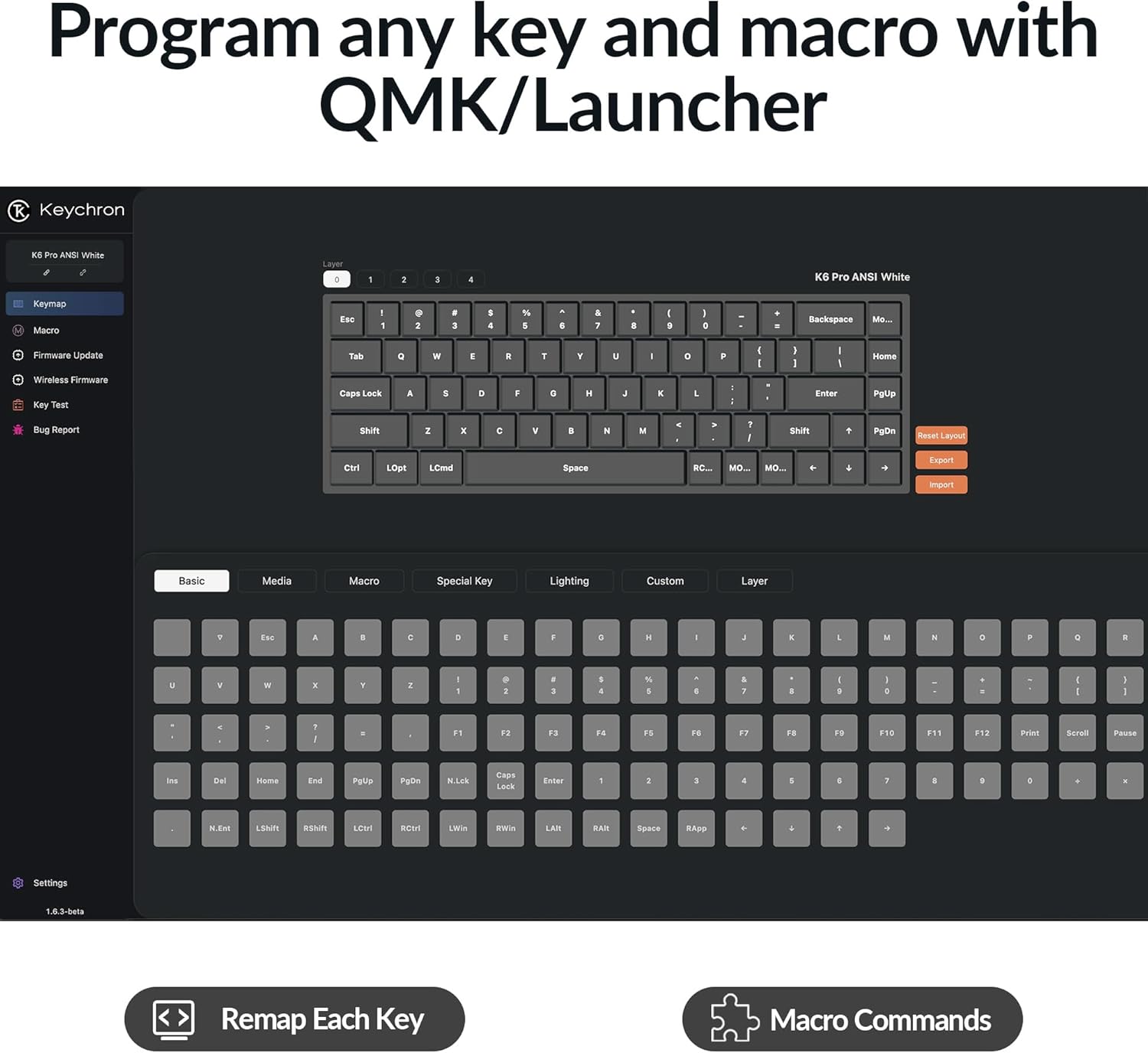 - Program keys with Launcher - Anyone can master any keys, macro commands or combination keys through Launcher web app with ease. Simply connect the K6 Pro to your device with a cable, drag and drop your favorite keys or macros to remap any key you want on any system (macOS, Windows, or Linux). *Note: User can remap a key on wired mode only. Once it's done, the keymap will work on both wireless and wired modes.