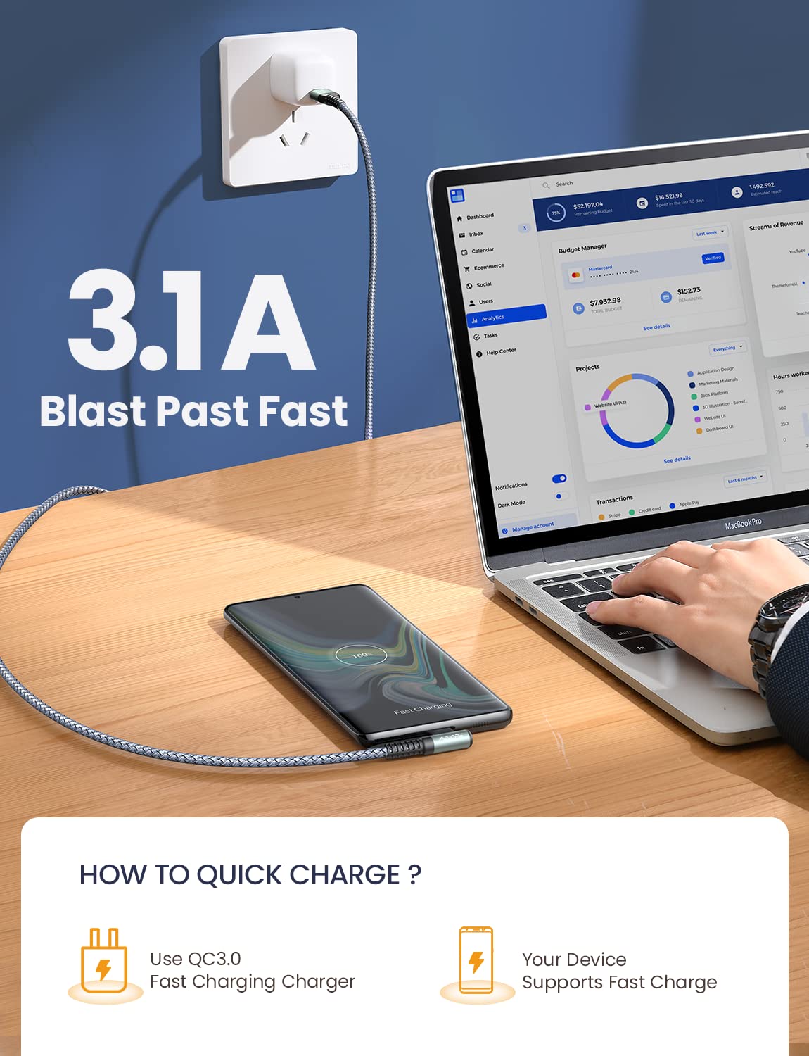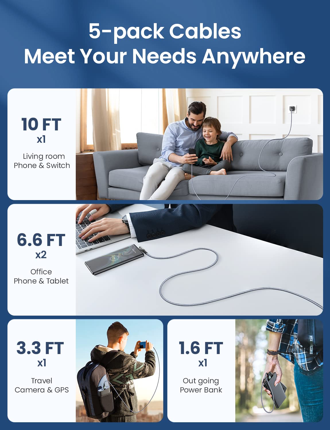 AINOPE USB C Charger 5-Pack [10/6.6/6.6/3.3/1.6ft] 3.1A Fast Charging, Right Angle, Nylon Braided, Compatible with Galaxy S22/21 Note20, LG V20