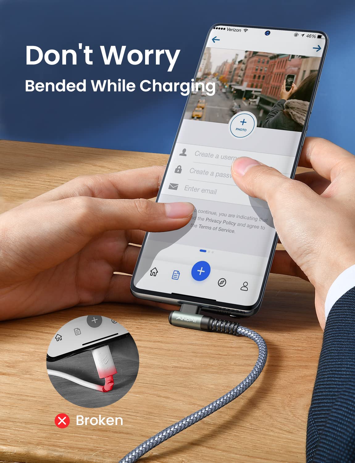 - 【Upgrade Exclusive Right-Angle Design】The USB C charging cable adopts an innovative 90° "L" shape design, which can effectively avoid the bending of the cable end and prolong the life of the USB to USB C cable. Gorgeous design for gamers and video enthusiasts, ergonomically to avoid "Gamer Thumb" (De Quervain's tenosynovitis). [Note: The thickness of the charging port of the compatible phone case is 5.5mm. ]