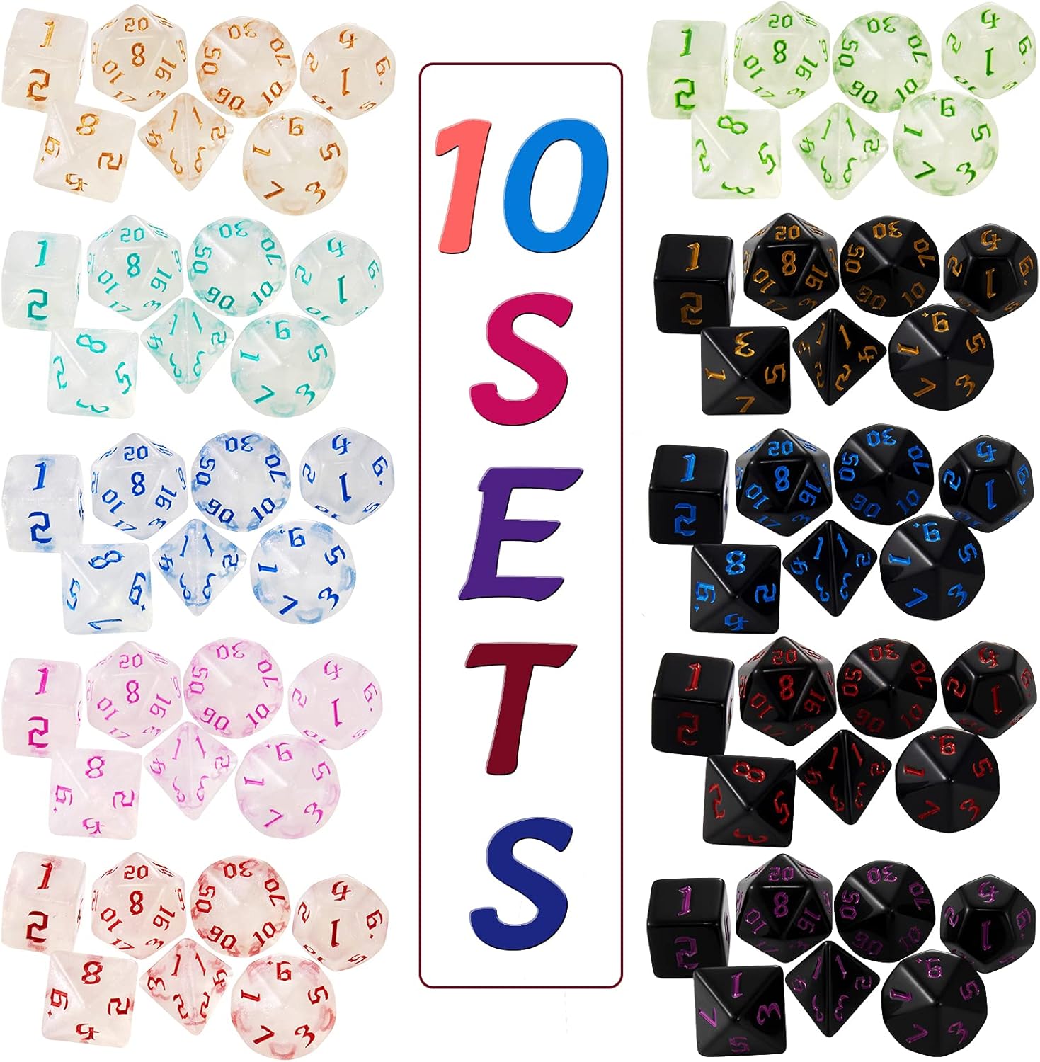 - 【DND DICE SET】: 10 x 7 dice set (70pcs), 10 drawstring bag.Special sickle font, Paired with different colored fonts, making d&d dice more unique.