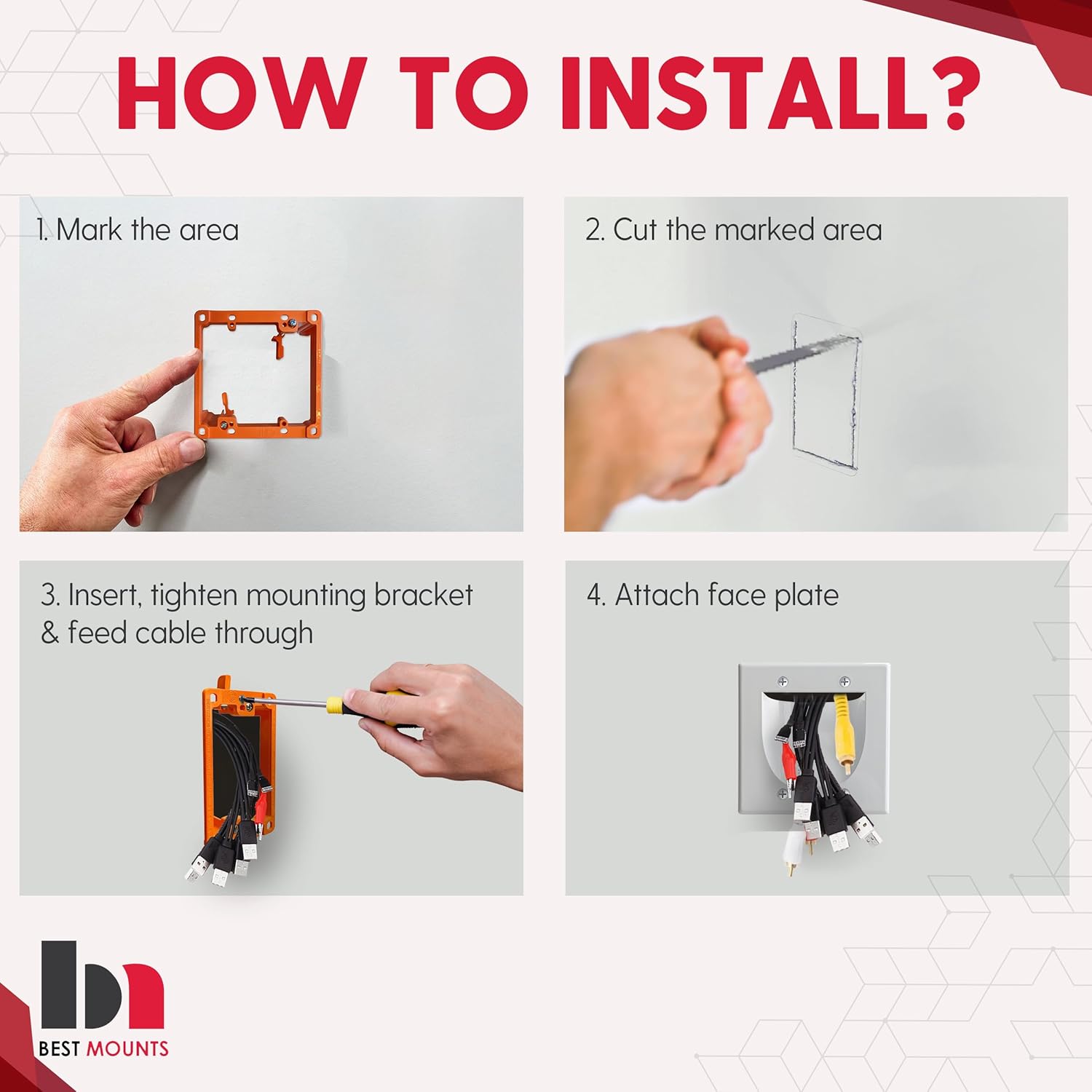- ππ ππππ πππππ ππππππππππ πππ β Bestmounts Single gang wall cable pass through is the perfect solution to conceal cords on wall up to 4 low voltage audio/video cables behind your wall-mounted flat panel TV (may hold more than 4 cables depending on type)