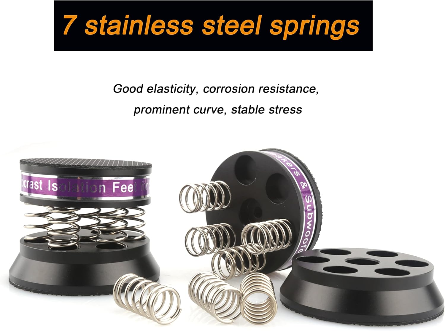 - ① The aluminum alloy spring speaker isolation foot pad is able to shock-absorbing effect on the audio equipment, and each one spring speaker isolation foot can bear a weight of about 9kg. The spring speaker isolation foot is made of solid aluminum alloy. The spring is made of solid stainless steel. The two different characteristics of aluminum alloy and stainless steel spring are combined into one which can display the advantages of both hifi and musicality