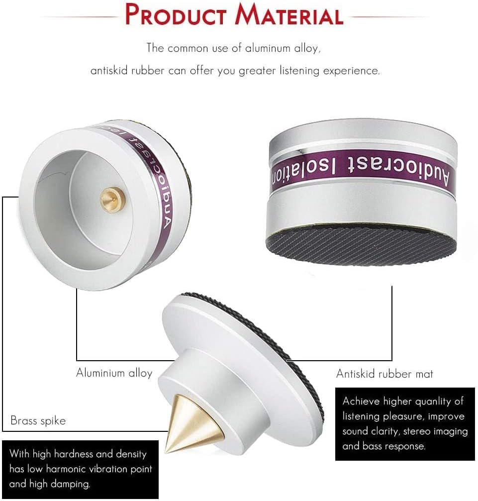 Tertullus 4 Pcs Aluminum Speaker Spike+Speaker Isolation Feet Top Pad Turntable Isolation Feet for Amplifier Speaker Turntable Player Subwoofer Silver