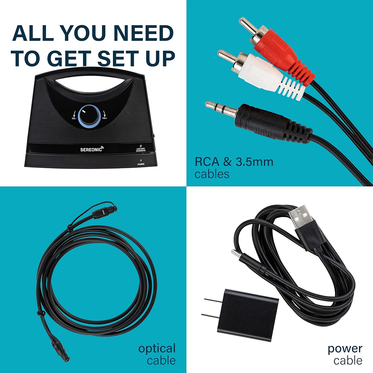- Versatile Receiver β Connect your wireless TV speakers for hard of hearing to any device with RCA, 3.5 mm (aux), or digital optical jacks. SEREONIC TV Speaker wireless base transmit custom-tuned, zero-lag RF audio from the base to the TV speakers for smart TV.