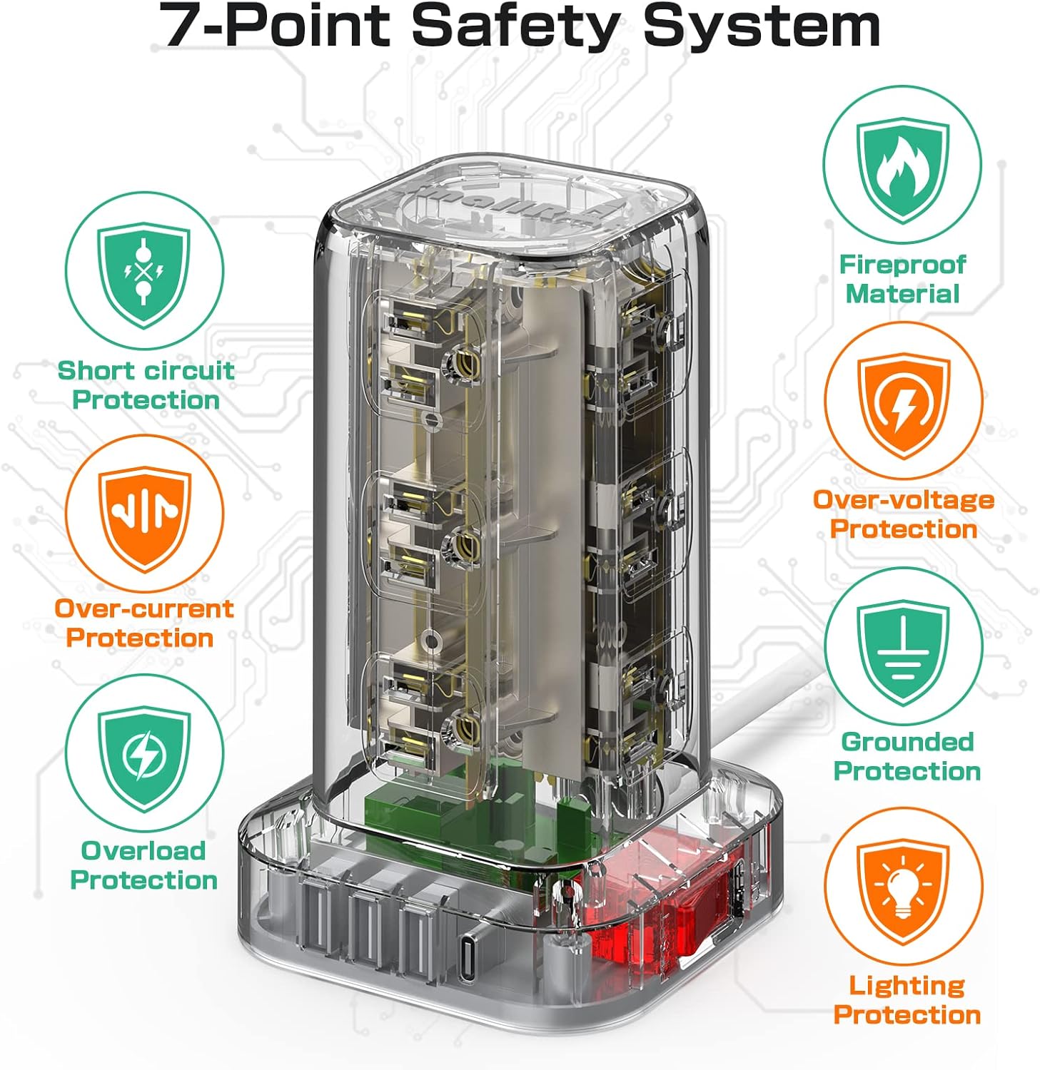 - 【Surge Protection & Overload Protection】- The surge protector tower with overload protection protects against spikes and fluctuations. The reset/off switch with integrated circuit breaker for overload protection of all outlets. This power strip has overload protection, short-circuit protection, over current protection, over-voltage protection and overheating protection. It will automatically cut power to protect connected devices when voltage surge is overwhelming.
