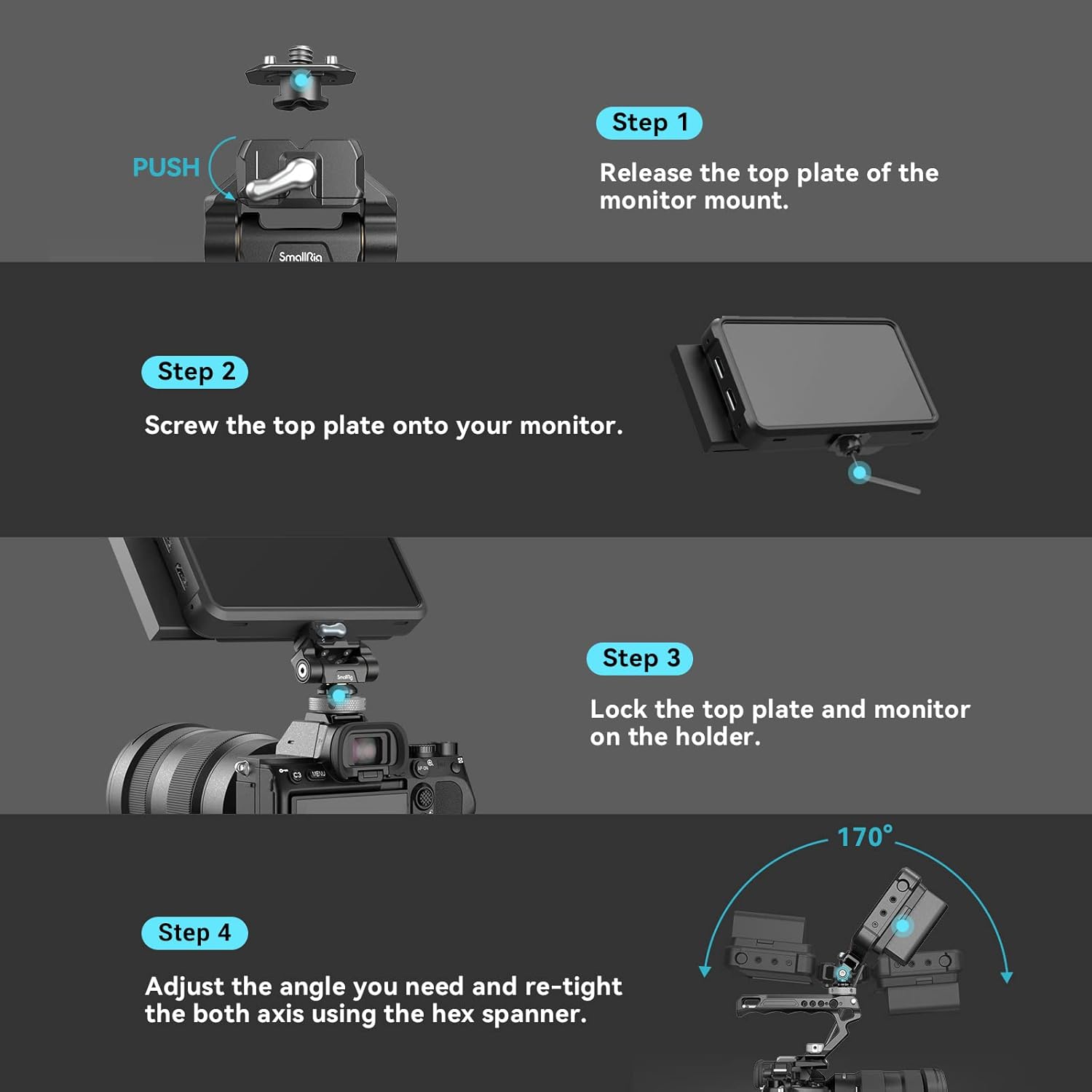 - 360° Swivel & 170° Tilt: The camera monitor holder enables to swivel 360° sideways and tilt 170° with free-stop in any positions and angles you preferred. It enables the cameraman to have better monitoring as per the needs in different shooting scenarios. Besides, its damping of pivot is adjustable through spanner