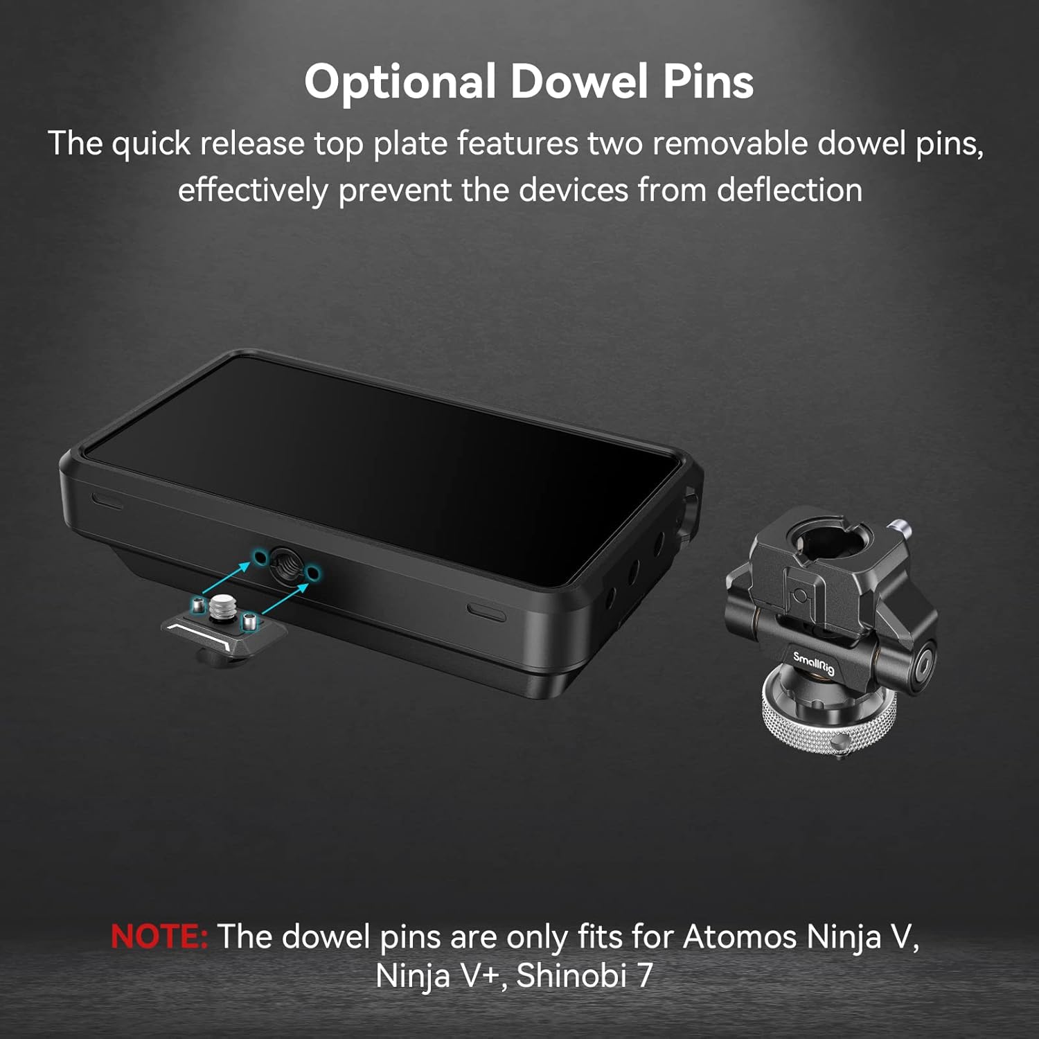 - For 5" or 7" Monitor: SmallRig monitor mount 3514C is designed to hold your monitor onto the top of the camera or other mounting system via cold shoe adapter. It features 1/4"-20 screw on the top for monitor, light, or microphone, and the quick release plate is reserved for 2 optional dowel pins, which can be removed and installed as needed to effectively prevent the devices from deflection