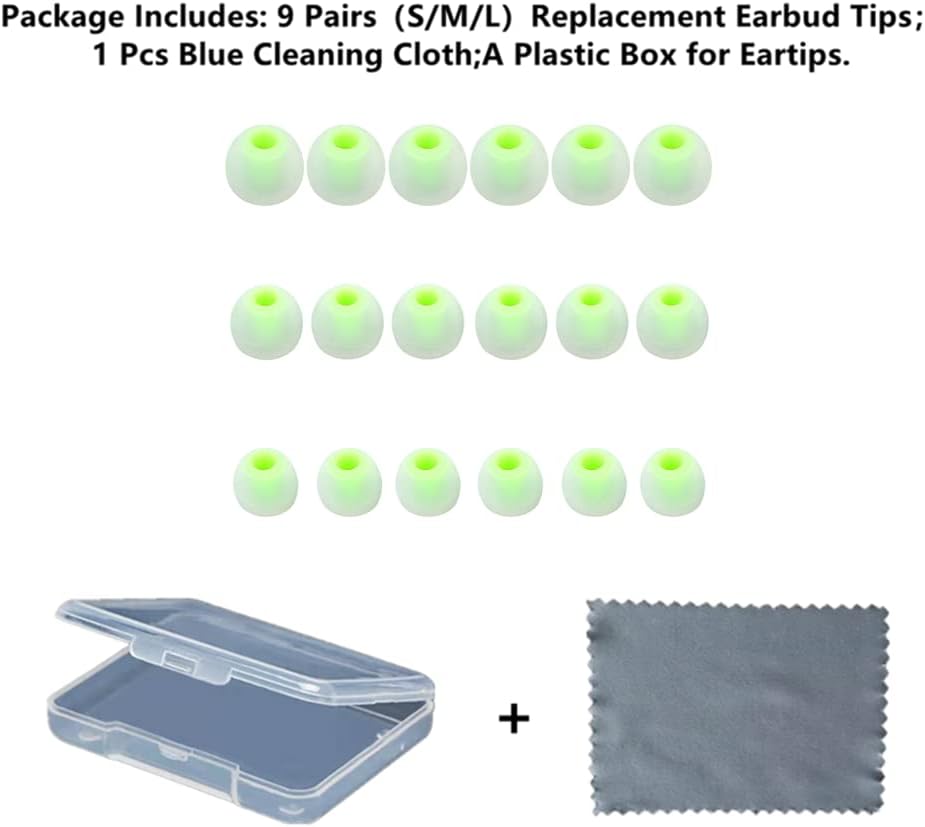 - Package Includes: 9 Pairs(S/M/L)Replacement Earbud Tips;1 Pcs Blue Cleaning Cloth;A Plastic Box for Eartips(Earbuds Only ,Earphones Not Included).