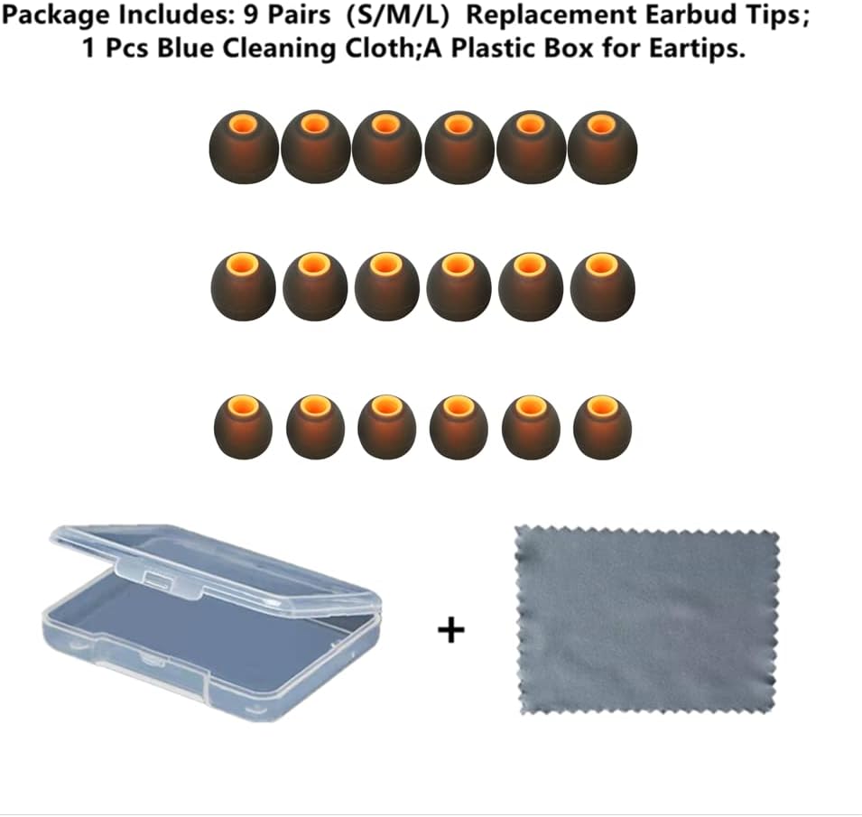 - Package Includes: 9 Pairs(S/M/L)Replacement Earbud Tips;1 Pcs Blue Cleaning Cloth;A Plastic Box for Eartips(Earbuds Only ,Earphones Not Included).