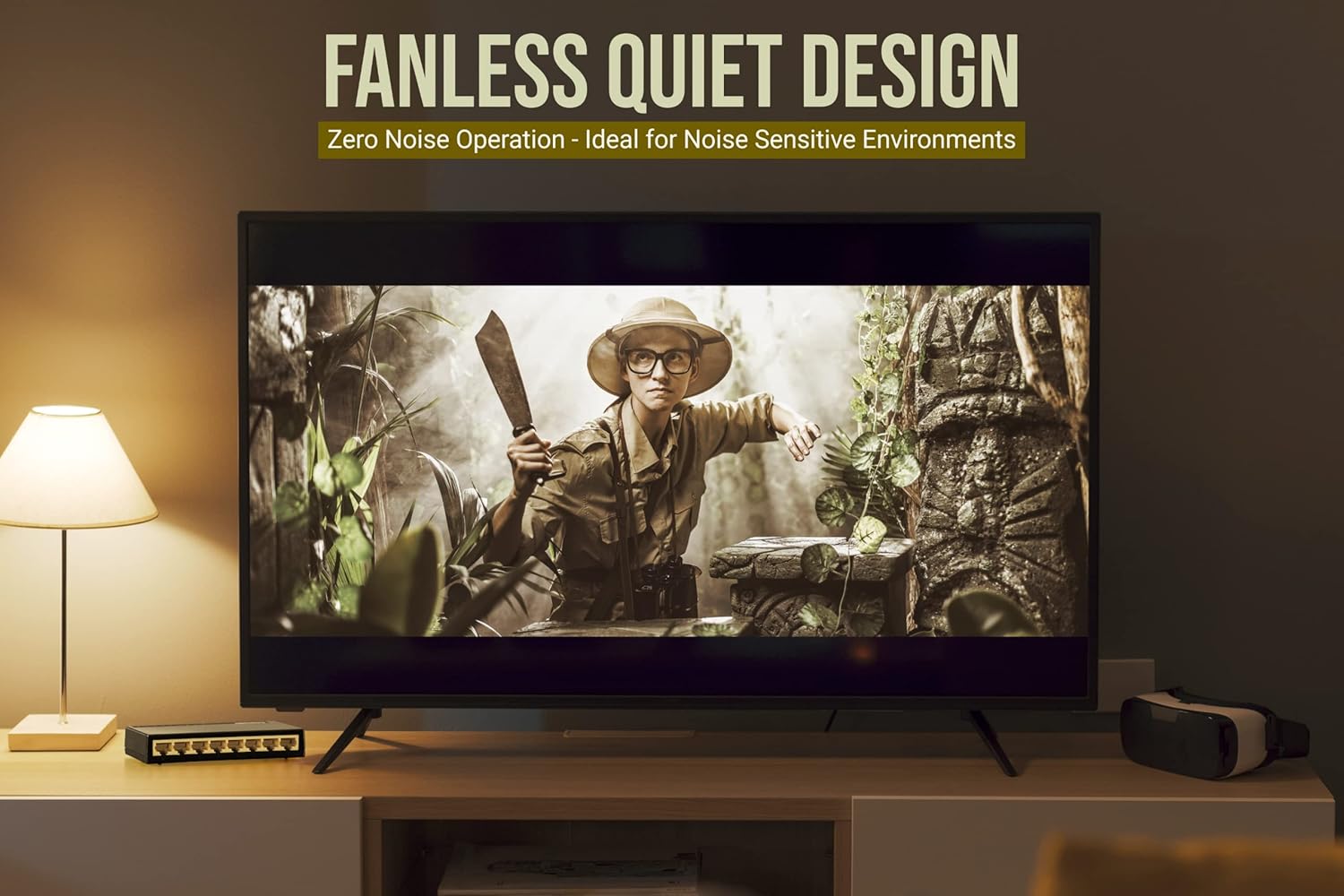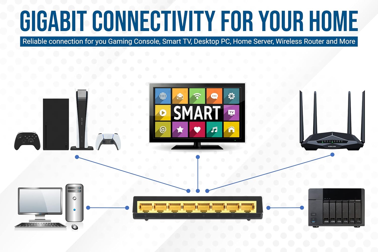 - Compact switch with eight Giigabit Ethernet ports to expand your network in an instant. Has Fanless design ideal for silent operation and Ultra-compact design.