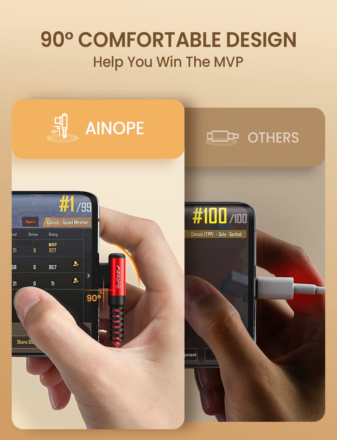 - [Upgraded Exclusive Right Angle Design]: When you use this 90-degree right angle elbow USB C Cable to charge your phone, you'll find that your fingers can tap the phone so naturally to play games and watch movies without hindrance, and your hand can perfectly hold the bottom to scroll the phone screen.