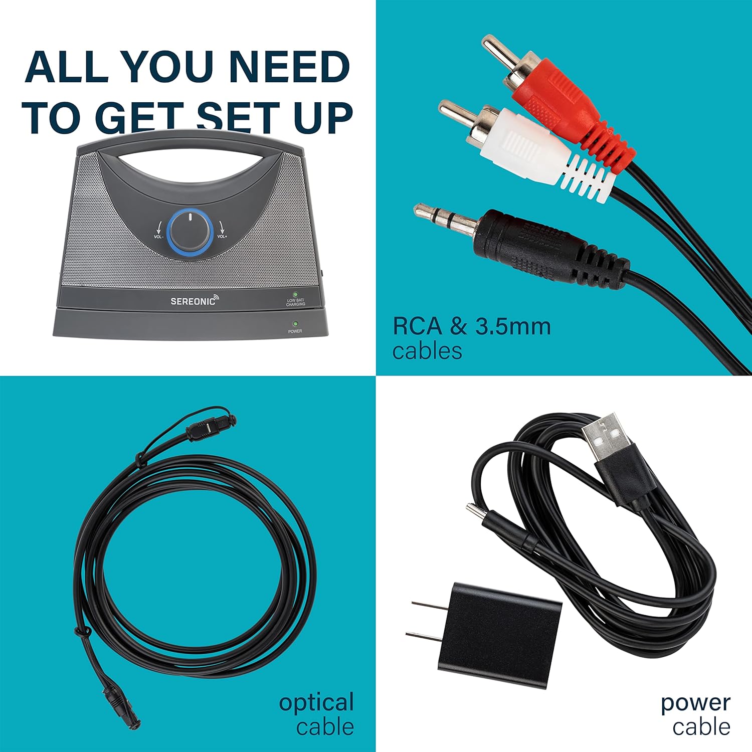 - Versatile Receiver β Connect your wireless TV speakers for hard of hearing to any device with RCA, 3.5 mm (aux), or digital optical jacks. SEREONIC TV Speaker wireless base transmit custom-tuned, zero-lag RF audio from the base to the TV speakers for smart TV.