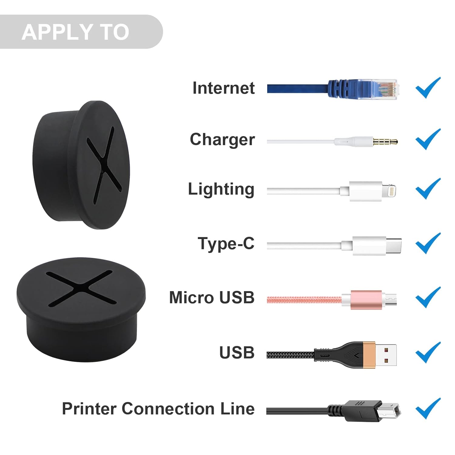 - 【Flexible Design】Flexible cord grommets design can accept many wires from any direction. Flexible top can hold wires and cables up to 1inch (25mm) in diameter.