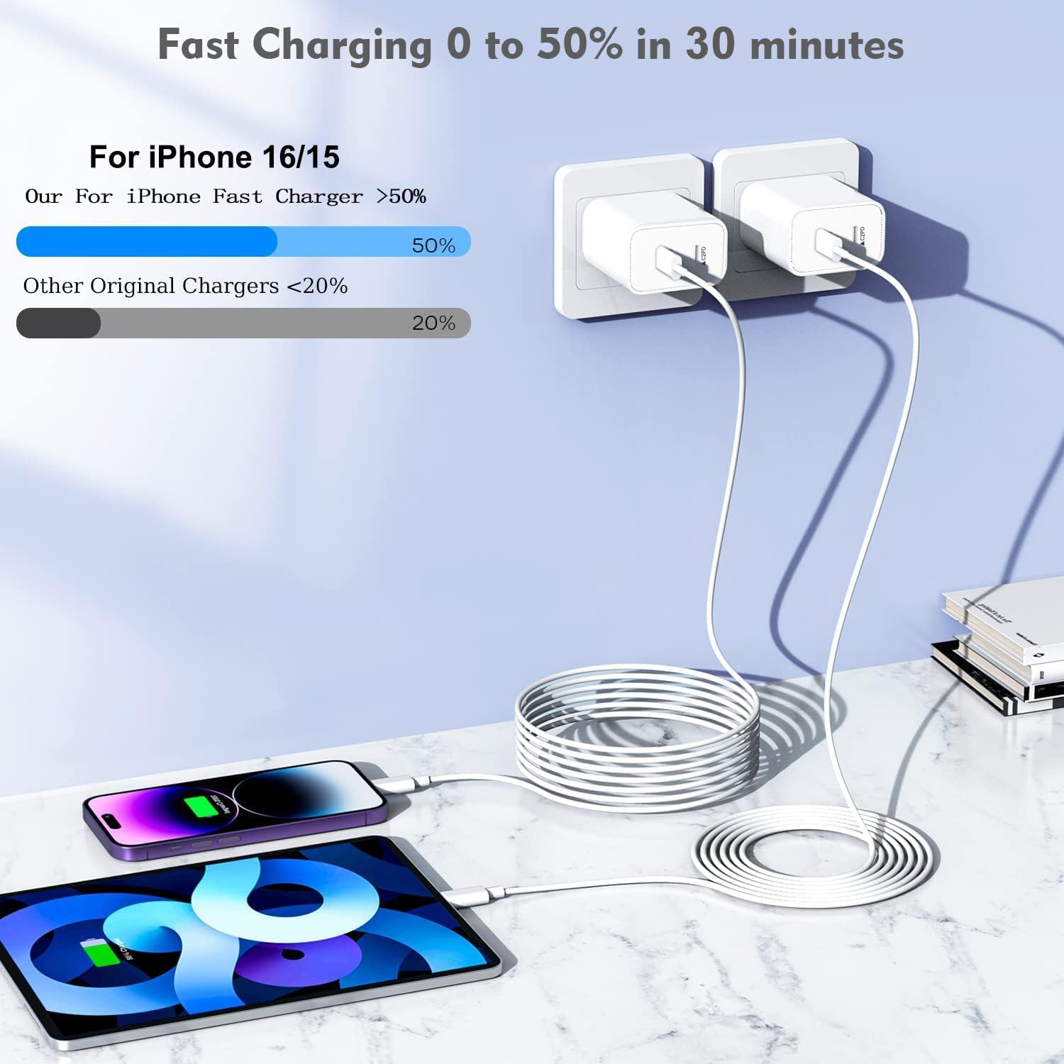 - [High-Speed Charging]this usb c wall charger with two independent output port,charge two of your usb-c device like compatible IPhone 16 15, with no impact on charging speed. PD 3.0 quickly charge USB C port provides 3X faster charging speed than original 5W charger for iphone do. It can charge for IPhone 16,15 up to 50% in just 30 minutes which saving over 1.5hrs for you.