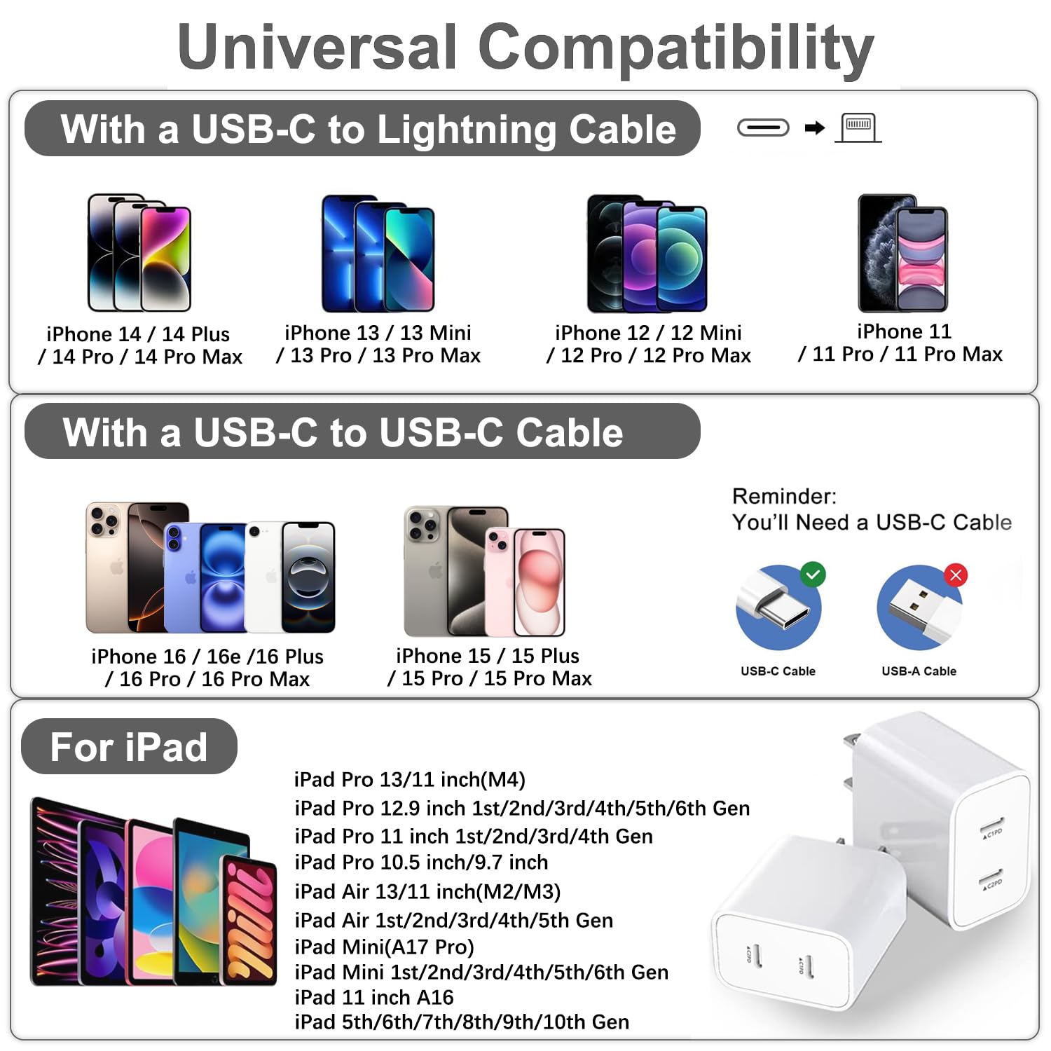 - [Perfect Compatibility]fully compatible with all USB C charging port,Fast charging works compatible with IPhone 16/16e/16 Plus/16 Pro/16 Pro Max/ IPhone 15/15 Plus/15 Pro/15 Pro Max/14/14 Plus/14 Pro/14 Pro Max/13/13 Pro/12/12 Mini/12 Pro/12 Pro Max/SE 2020/11/11 Pro/11 Pro Max/XS/XS Max/XR/X 8 Plus and also works compatible with iPhone 7 6 Plus,5 5c 5s SE at a standrad charging speed.