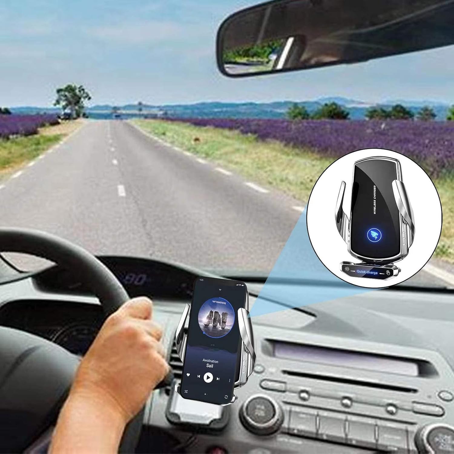 - ONE HAND OPERATION:The infrared sensor at the bottom will automatically release the clamp and tightly clamp the phone, The phone can switch horizontally and vertically.The car phone holder mount wireless charging 360 Degree rotating ball helps you to find the most suitable angle for safe driving. Put the phone close to the vent mount wireless charger, The infrared sensor at the bottom will release the clips automatically and clamp the phone tightly