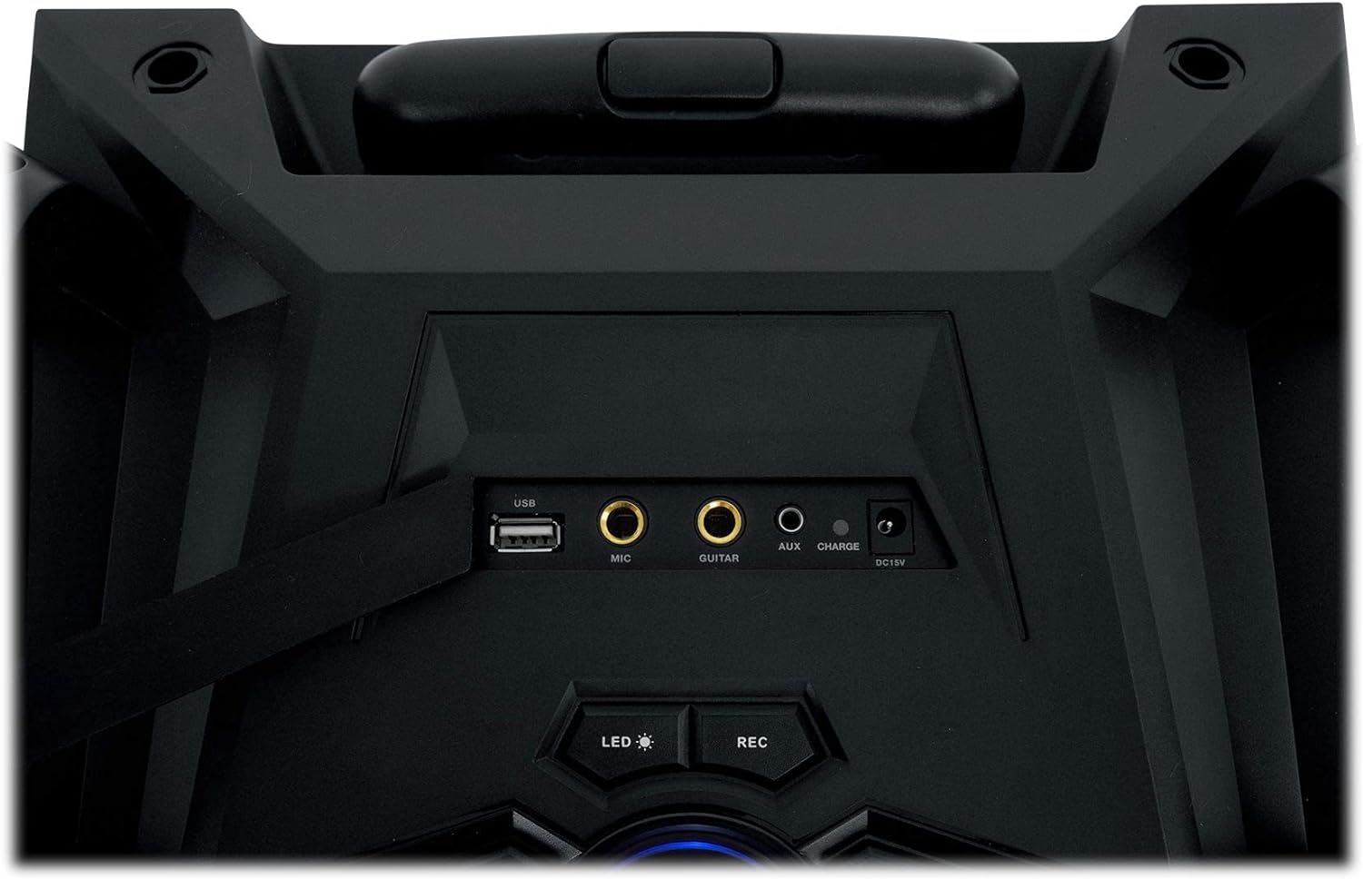 - PORTABLE AND VERSATILE DESIGN: Built-in wheels and handles ensure easy transport. Features XLR, 1/4" mic, 1/4" guitar inputs, USB, and SD card slots for diverse audio sources.
