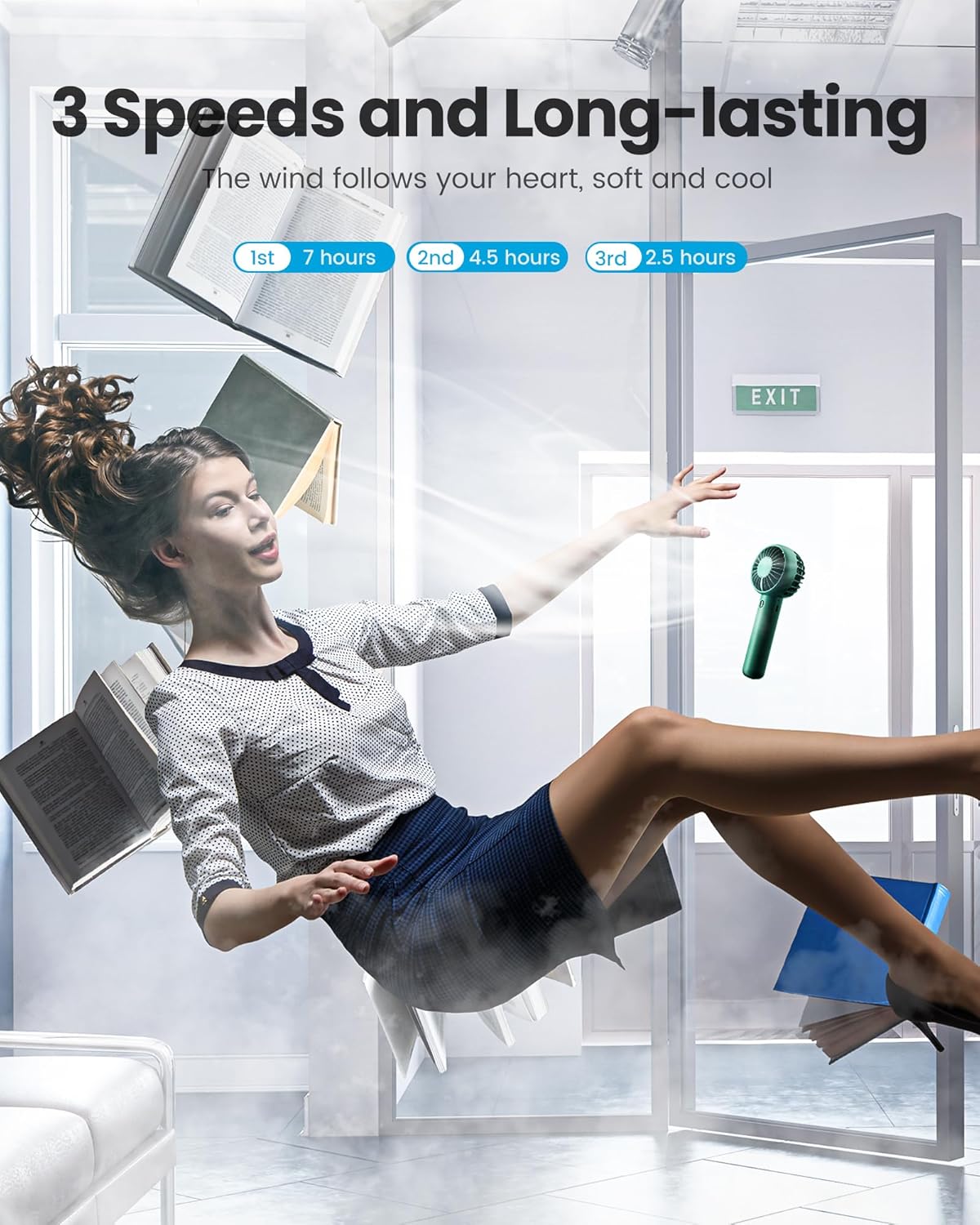 - Powerful wind & 3-speed setting: Built-in powerful brushless motors, which can generate strong wind; The hand fan has 3 adjustable wind speeds, press it for low-speed 3500r/m, medium speed 4500r/m, and high-speed 7500r/m