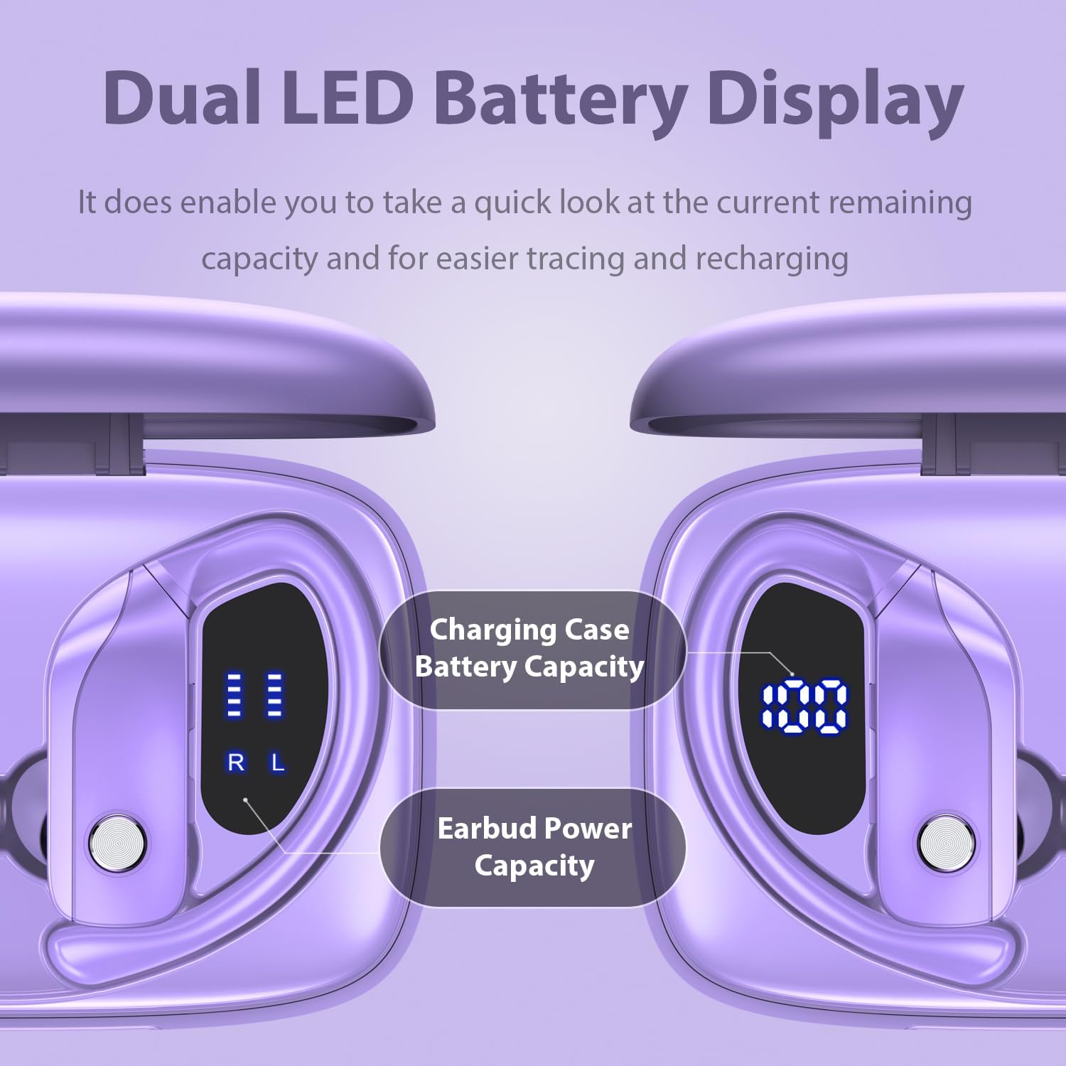 bmanl Wireless Earbuds Bluetooth Headphones 48hrs Play Back Sport Earphones with LED Display Over-Ear Buds with Earhooks Built-in Mic Headset for Workout Purple