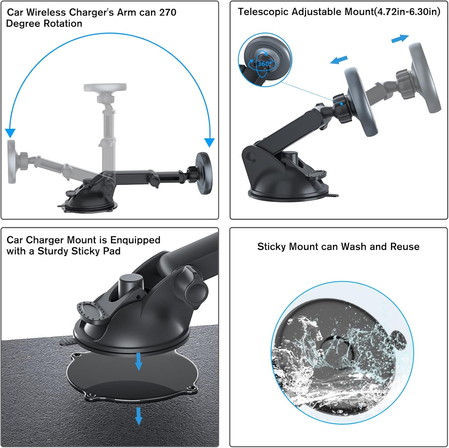 - Phone Holder Fits for Mag safe: Wireless car charger with fast charging/Mag safe function (Note: Charging for iphone 16/15/14/13/12 series are quickly , but for iphone 11 or other Android series are very slowly.),giving the driver a safe driving experience and a happy mood of relaxed driving. The extension arm solves the problem of using hands to operate the mobile phone and blocking the views when speed up. 360°adjustable give you optimal view.