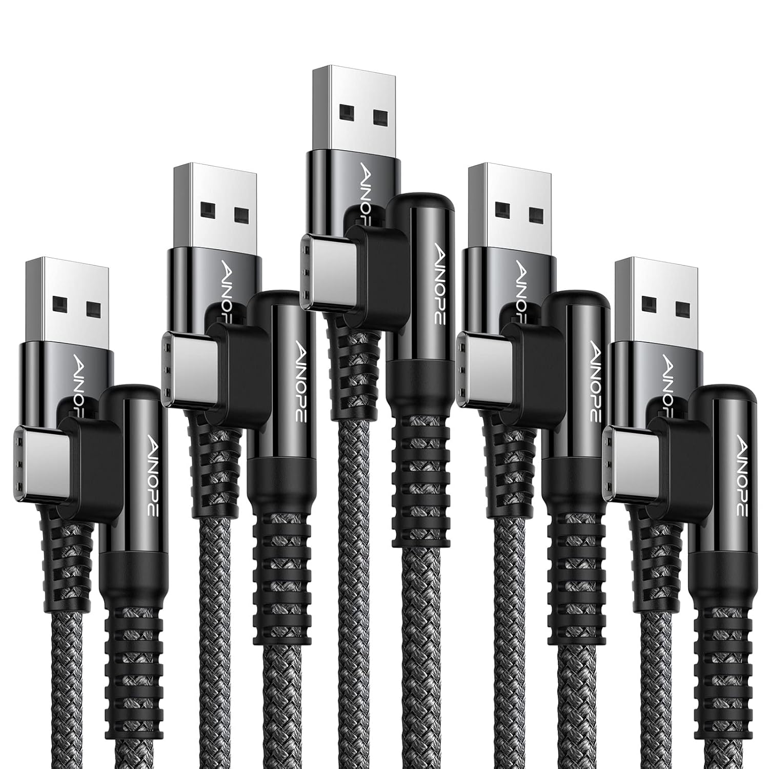 AINOPE USB Type C Cable 5-Pack [10/6.6/6.6/3.3/1.6ft] 3.1A C Type Charging Cable Right Angle, Nylon Braided USB C Cable Compatible with Galaxy S22 S20 Plus, Note 20, LG V20, Type C Charger Black